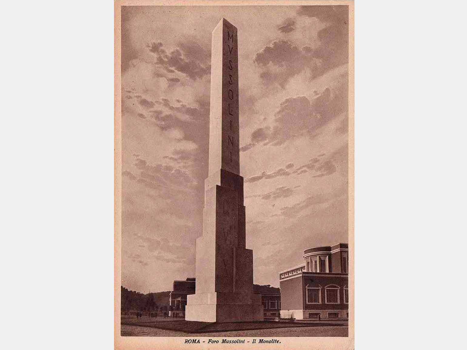 Обелиск Муссолини с логотипом Mussolini Dux («Муссолини — вождь») в центре Форума МуссолиниФото: Public Domain