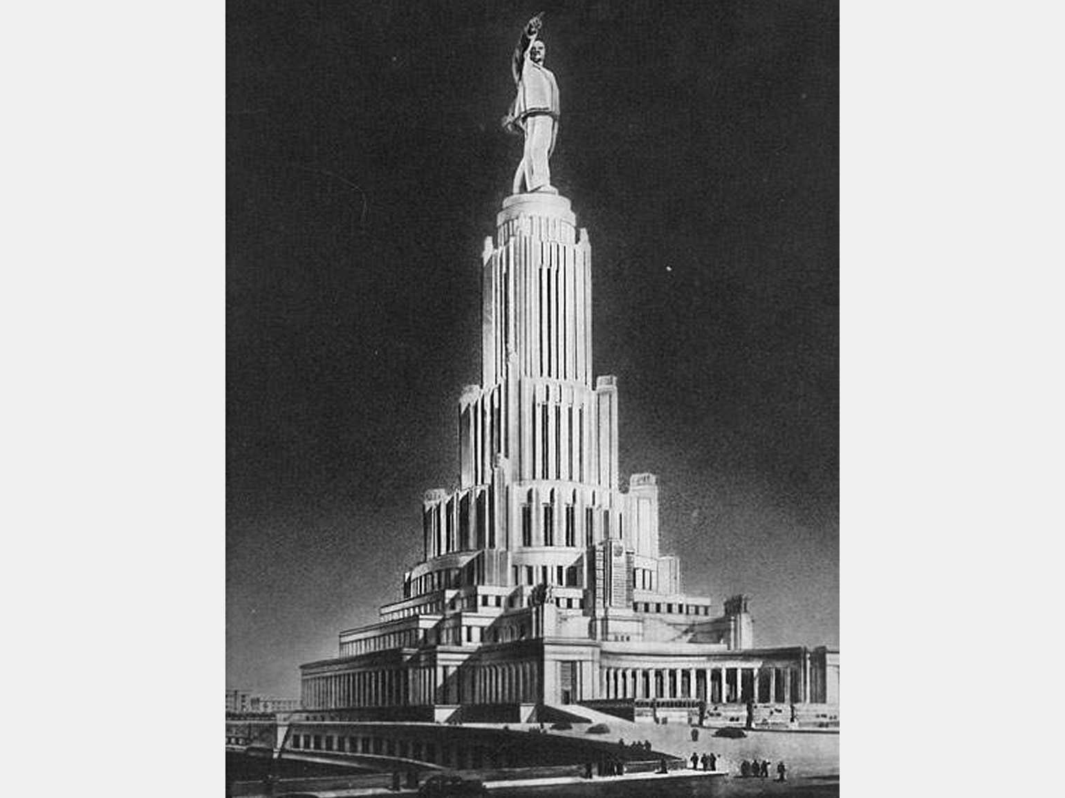 Главный советский мегапроект тридцатых — Дворец советов, архитектурный конкурс на создание которого был организован в 1931 году. Победу в нём одержал неоклассик Борис Иофан, предложивший небоскрёб высотой 415 м с гигантской скульптурой Ленина на крыше. Уступчатая структура дворца напоминала зиккурат. В основании, благодаря сложнейшему металлическому каркасу, предполагалось расположить гигантский актовый зал.