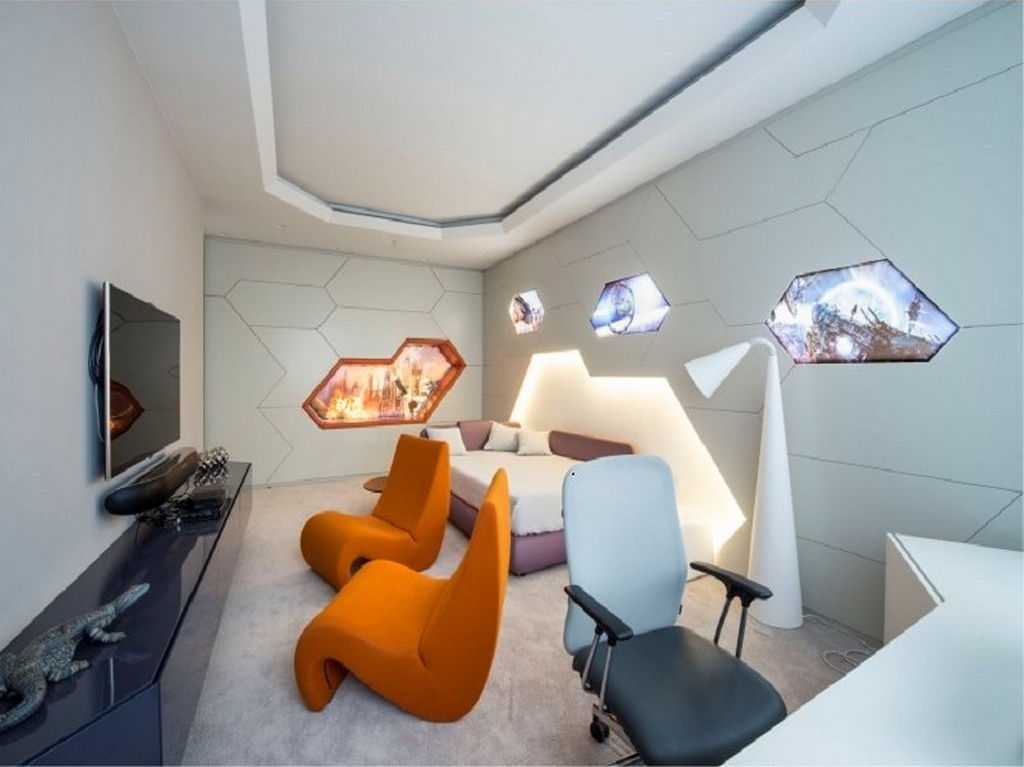 Трансформируемая мебель, раскладные кровати, выдвижные столики, скрытые системы хранения важны для экономии пространства и следования принципу максимальной функциональности. В комнате минимум аксессуаров и декора и максимум техники – плазменный телевизор, аудиосистема, компьютер и другие достижения прогресса, кроме своей основной функции, служат и стилевым обозначением интерьера.