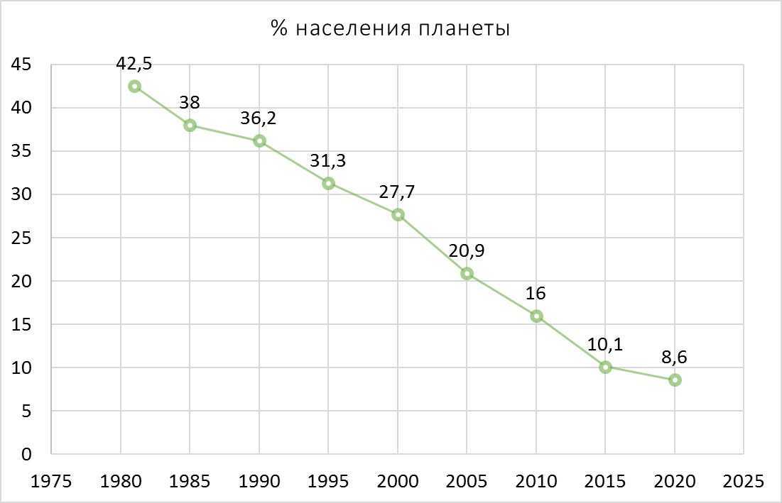 Взглянем на данные Всемирного банка по уровню бедности с 1981-го по 2020-ый годы .