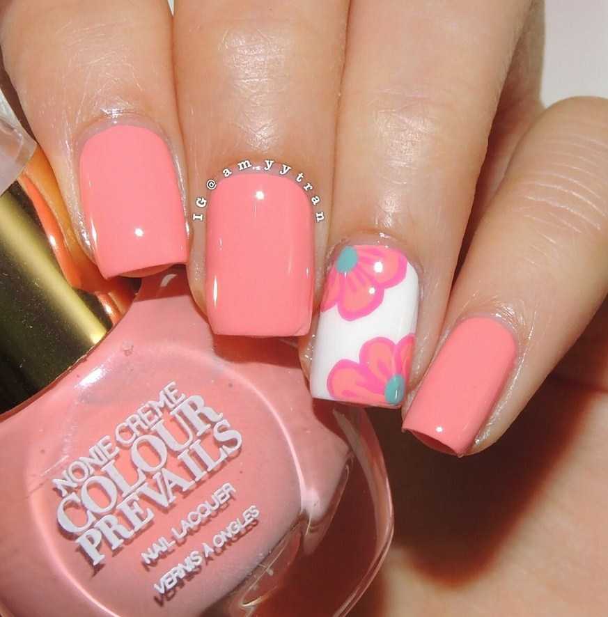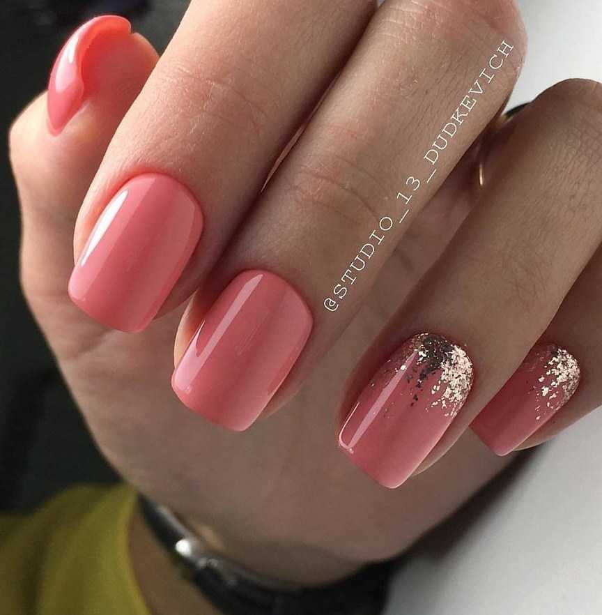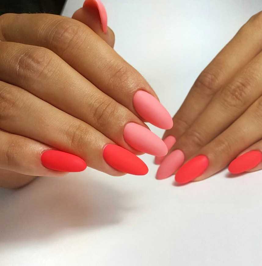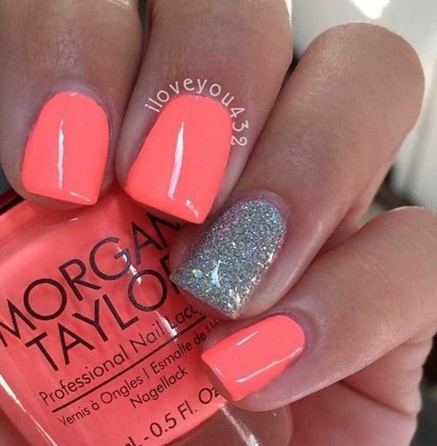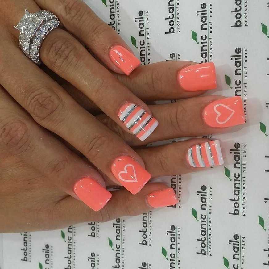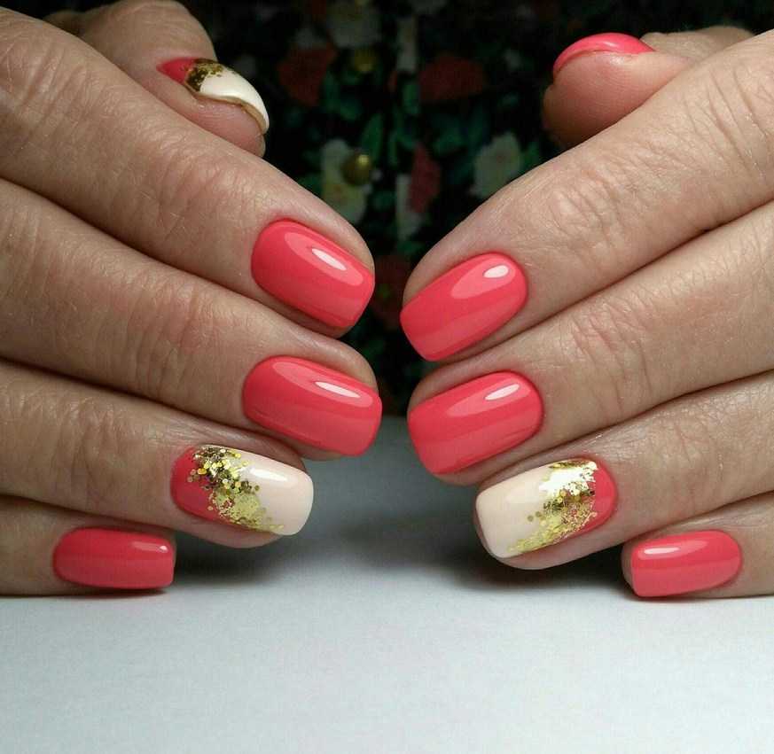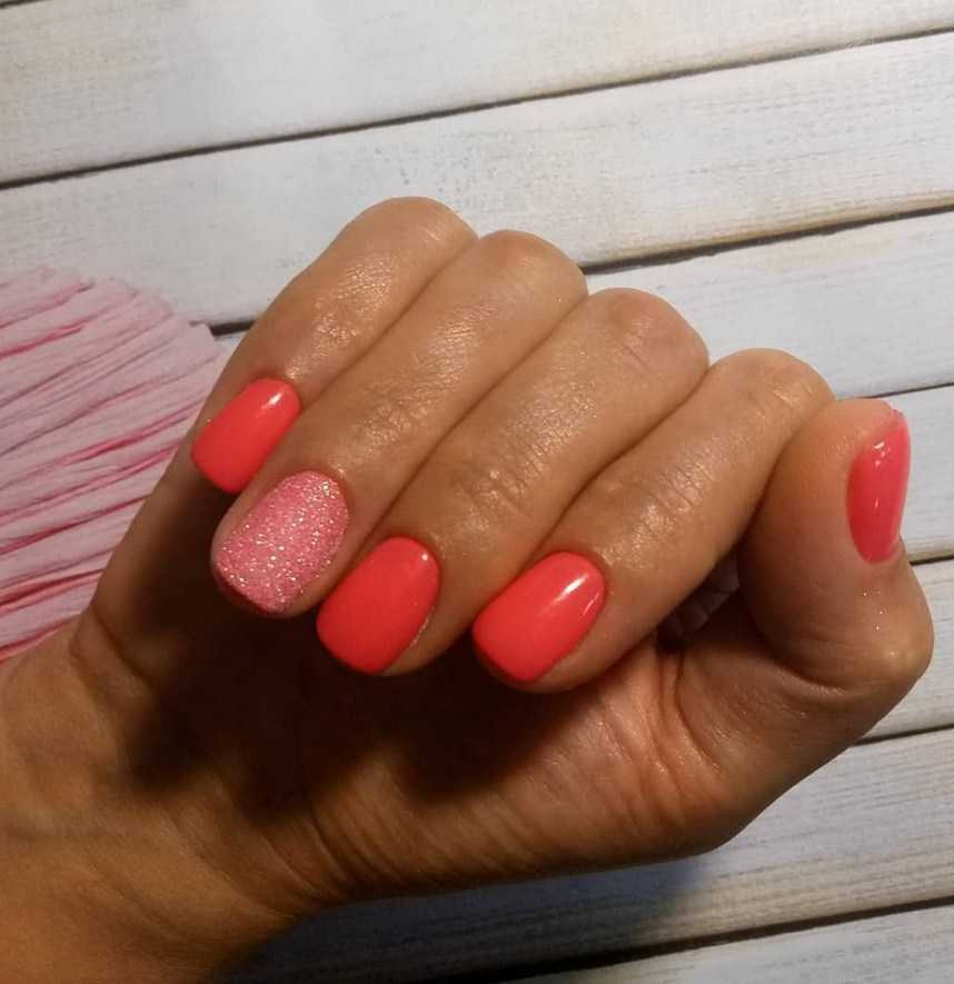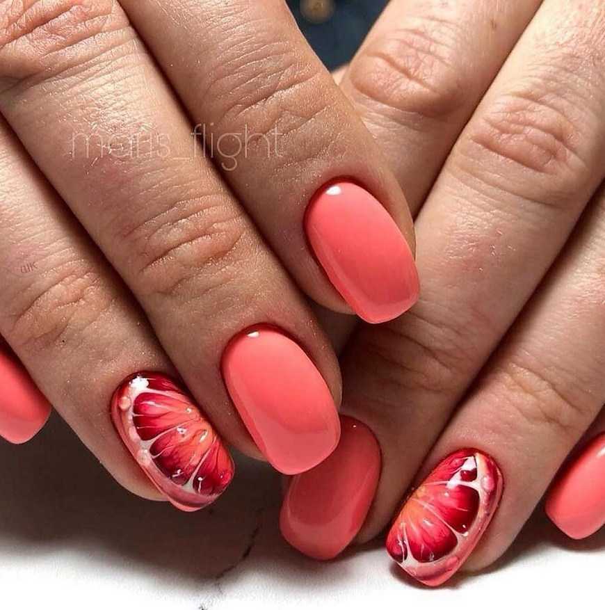 Дуэт коралла и розового выглядит по-настоящему летним, радостным. Можно использовать коралловый маникюр с дизайном разные руки, применять техники омбре или градиент с плавными переходами тонов, рисовать сердечки и цветочки, либо просто выкрасить по одному ногтю на каждой руке в розовый цвет.