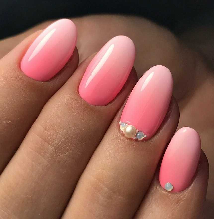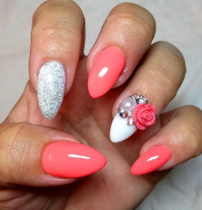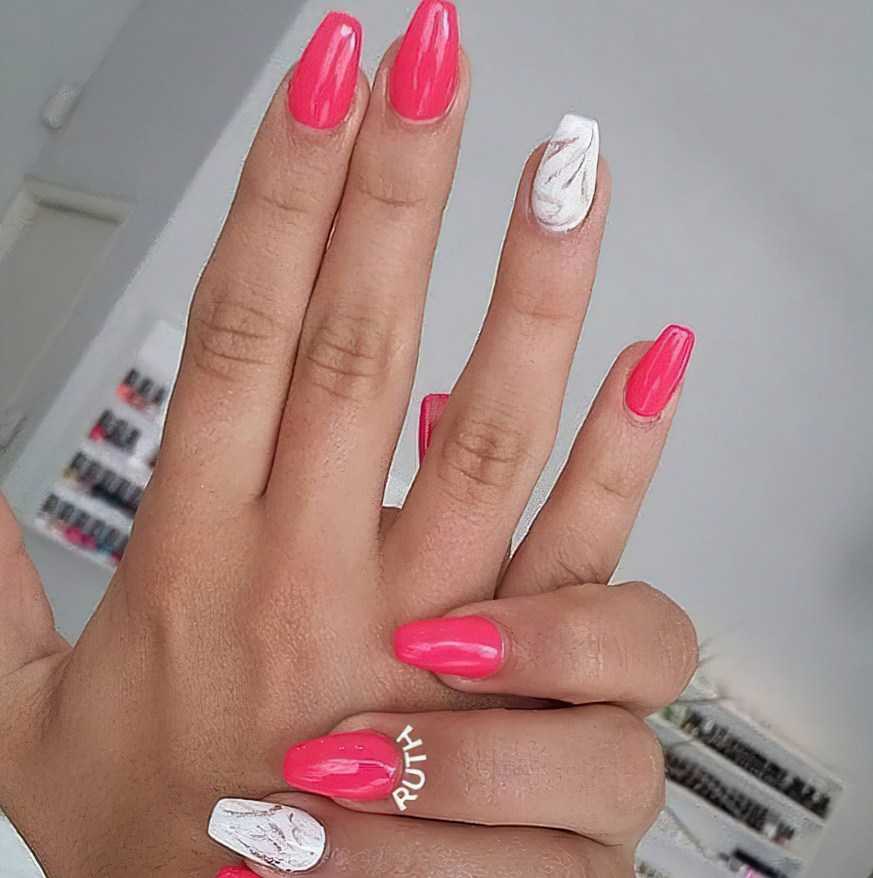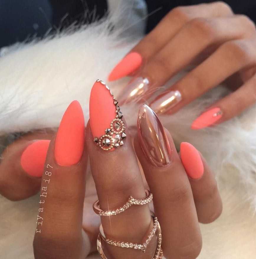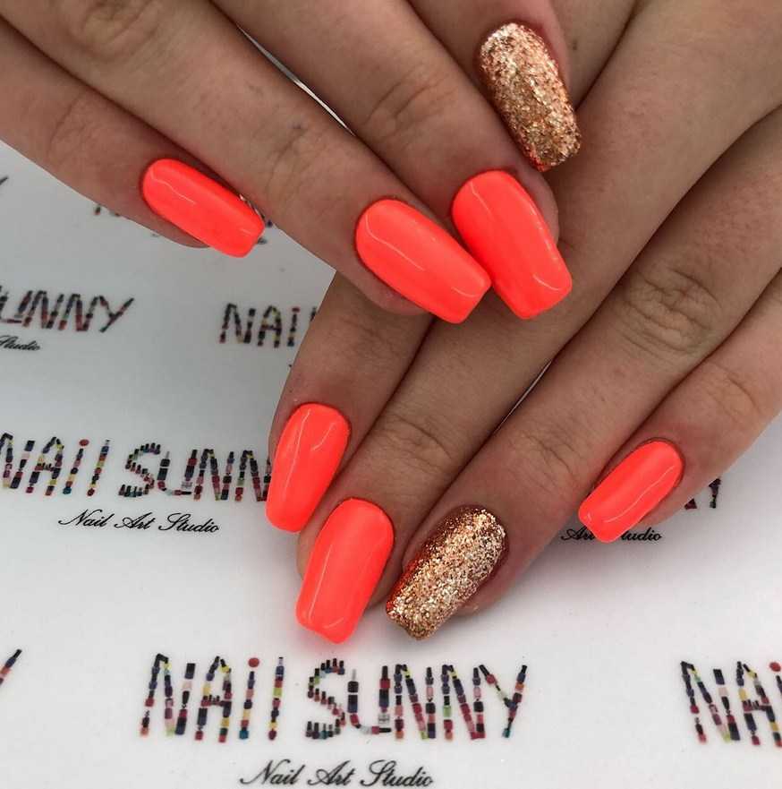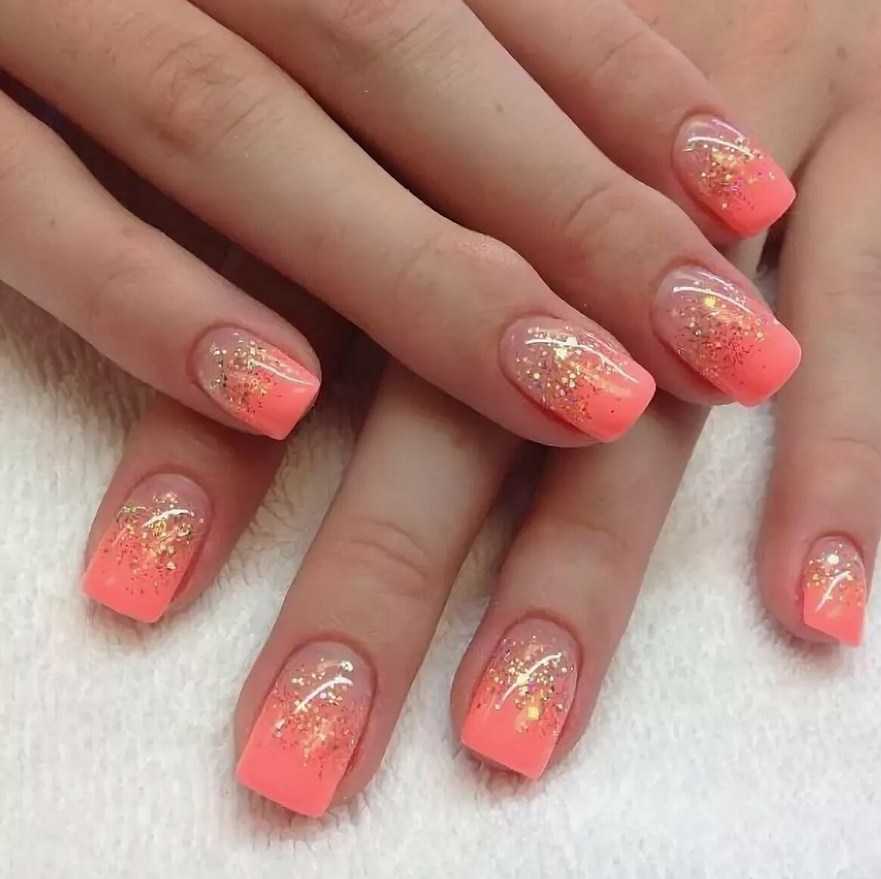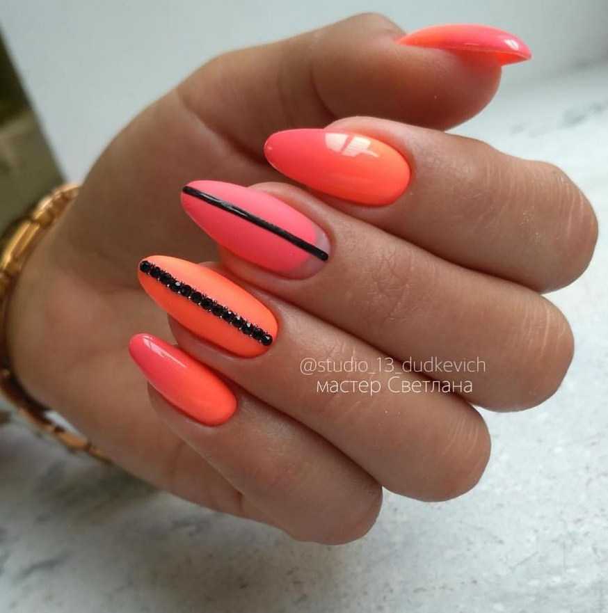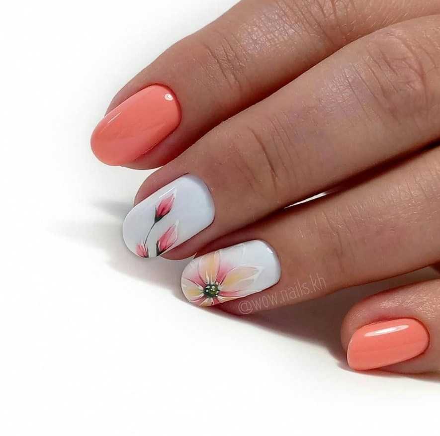 Дуэт коралла и розового выглядит по-настоящему летним, радостным. Можно использовать коралловый маникюр с дизайном разные руки, применять техники омбре или градиент с плавными переходами тонов, рисовать сердечки и цветочки, либо просто выкрасить по одному ногтю на каждой руке в розовый цвет.
