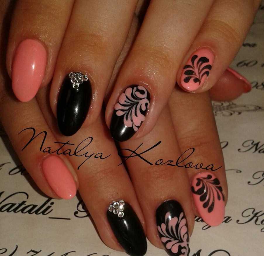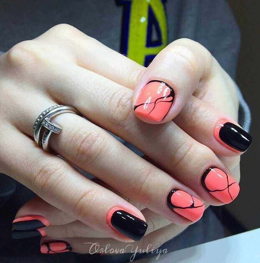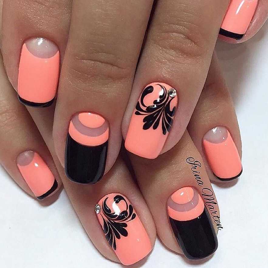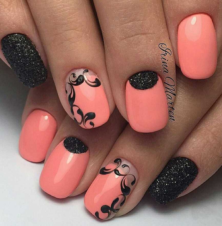 Коралл можно применять как базу для прорисовки чёрного декора – надписей, ажурного кружева, вензелей, узоров, сердечек. Контрастное сочетание выглядит модно, причём чёрный тон добавляет нейл-арту элегантности и делает его более спокойным, ненавязчивым.