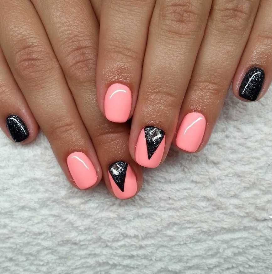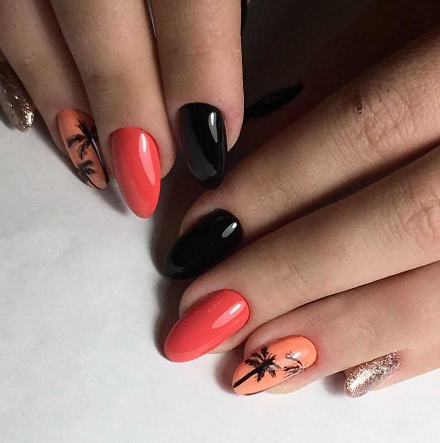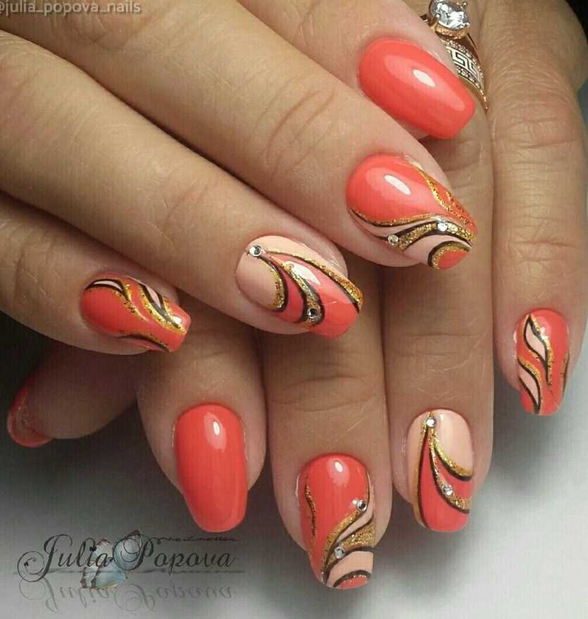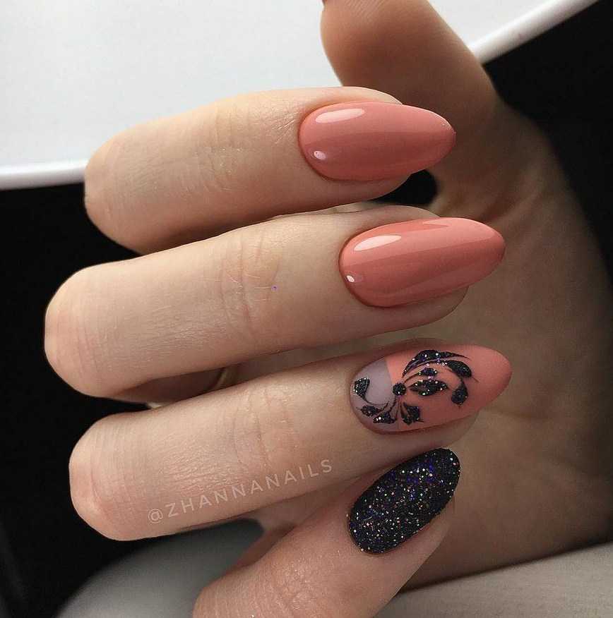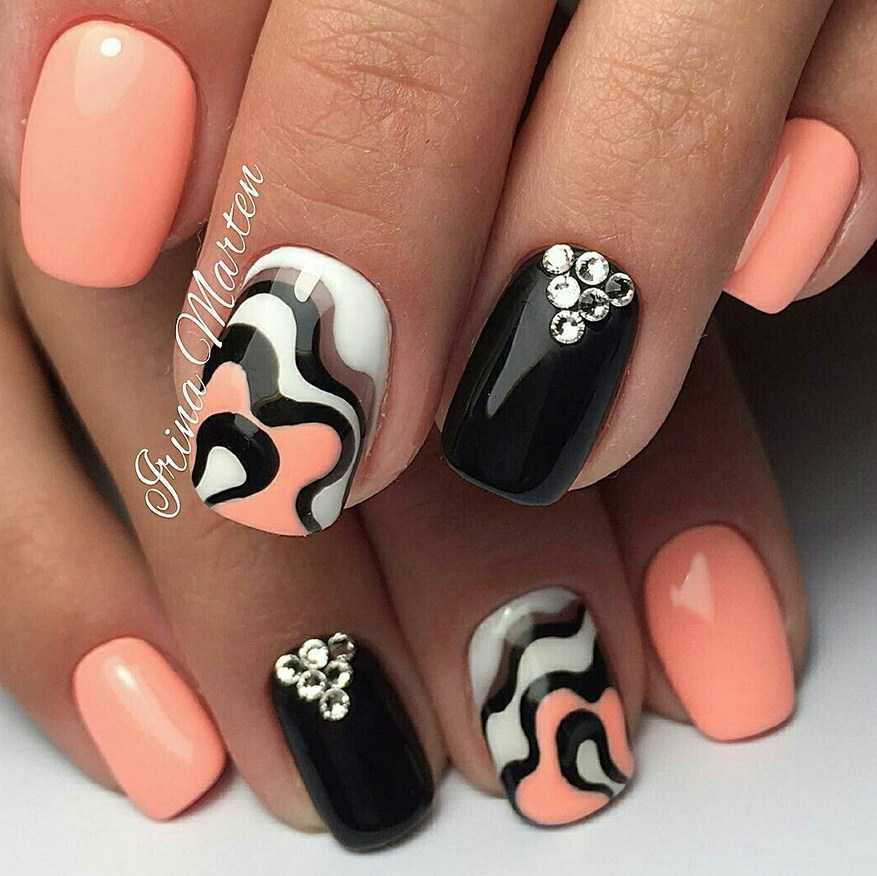 Коралл можно применять как базу для прорисовки чёрного декора – надписей, ажурного кружева, вензелей, узоров, сердечек. Контрастное сочетание выглядит модно, причём чёрный тон добавляет нейл-арту элегантности и делает его более спокойным, ненавязчивым.