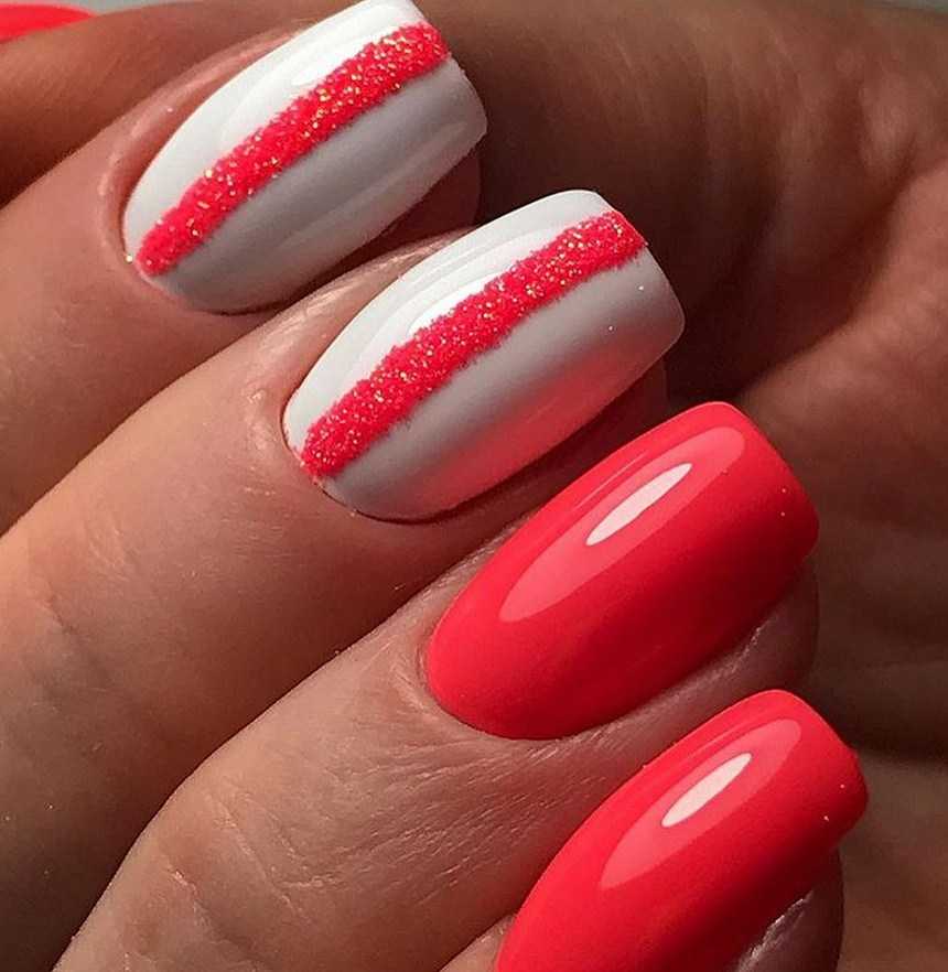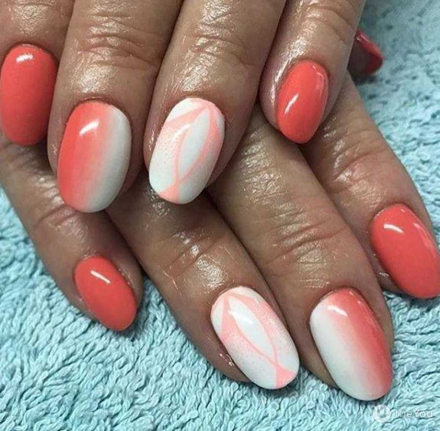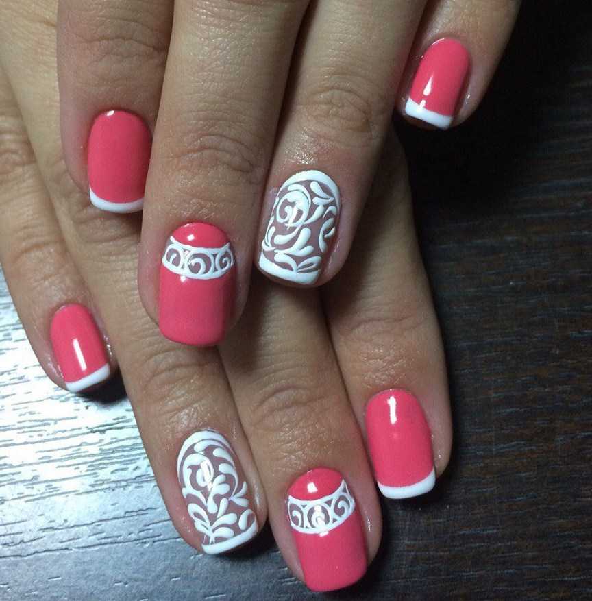 Такое сочетание признаётся классическим и чаще всего применяется дизайнерами. Маникюр коралловый с белым смотрится просто, но очень стильно. Основные способы использования дуэта – френч, лунный дизайн, рисунки, геометрия и полоски, чередование коралла и белых ноготков.