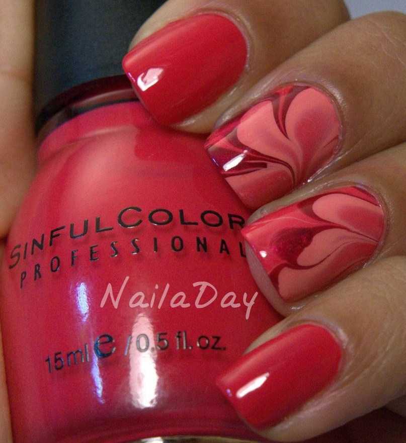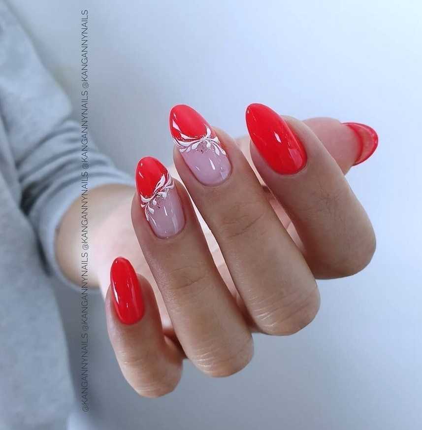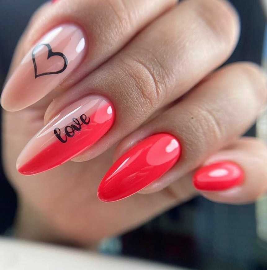 При добавлении светлых оттенков красный и коралл шикарно комбинируется в технике омбре, ведь они принадлежат к одной цветовой гамме. Также ярким красным или алым лаком можно нанести на нежный, светлый коралл интересные надписи, рисуночки – нейл-арт получится броским и модным.