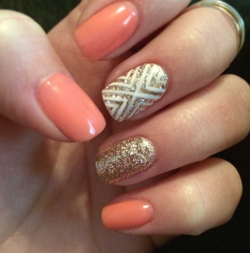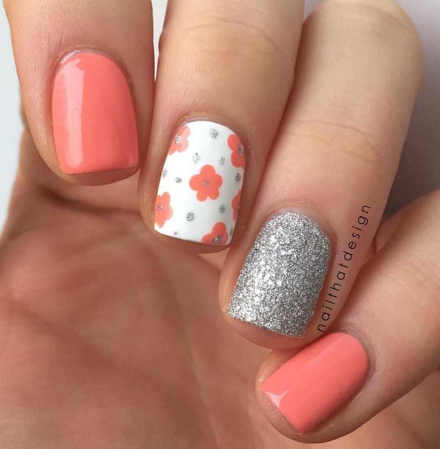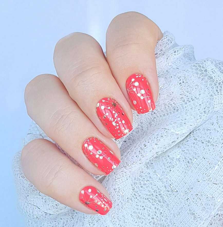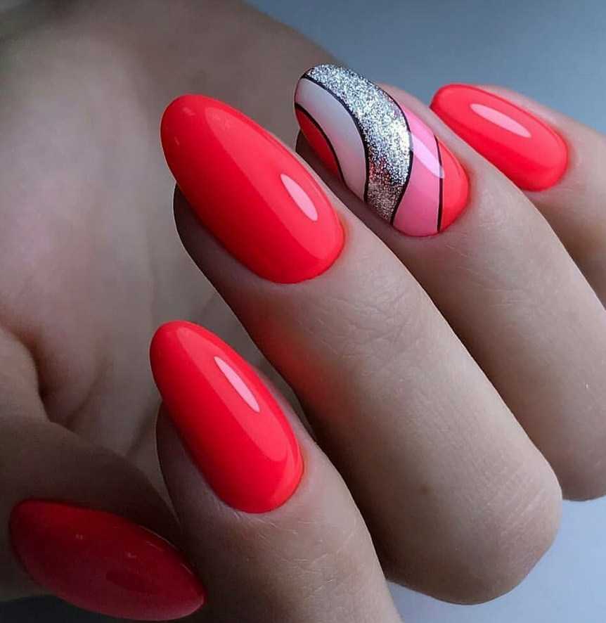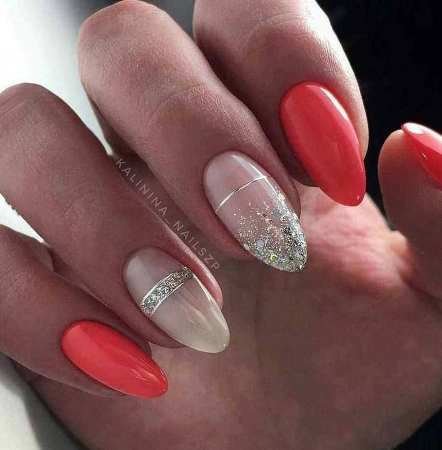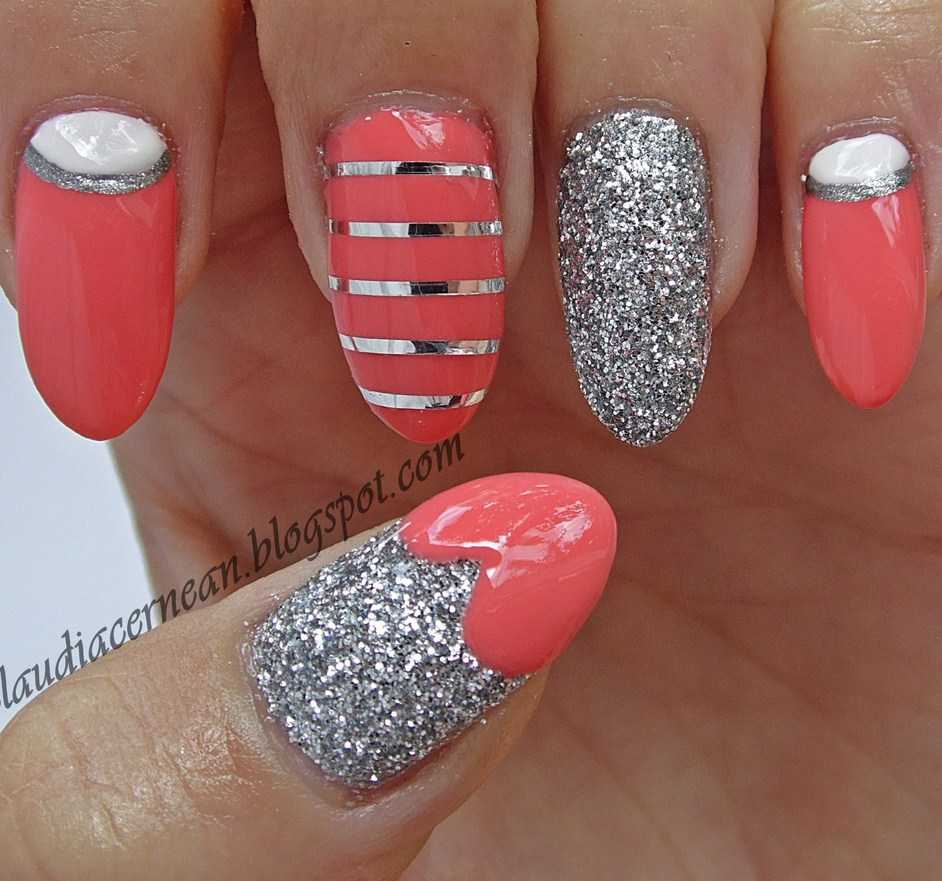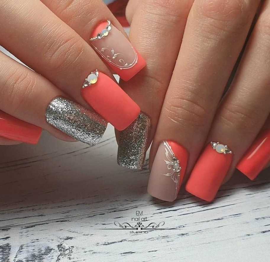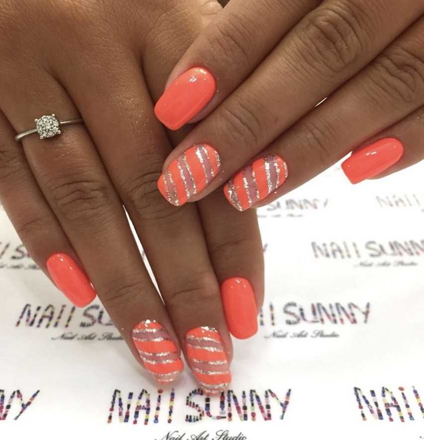 Серебро и коралл – красивая комбинация оттенков, которая является не слишком броской, поэтому подходит и для повседневного дизайна, и для праздника. На однотонную основу наносят серебристую втирку, украшают некоторые пальчики фольгой, наклеивают серебряные полоски, геометрические узоры.