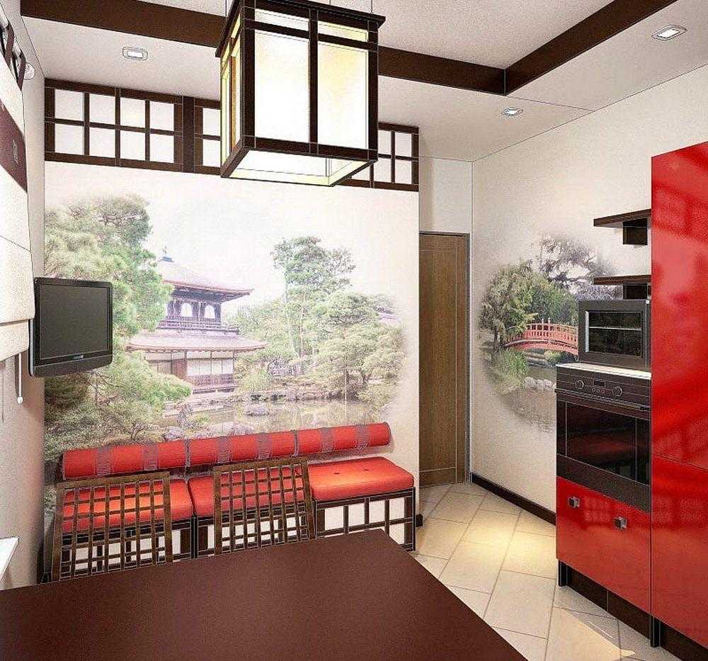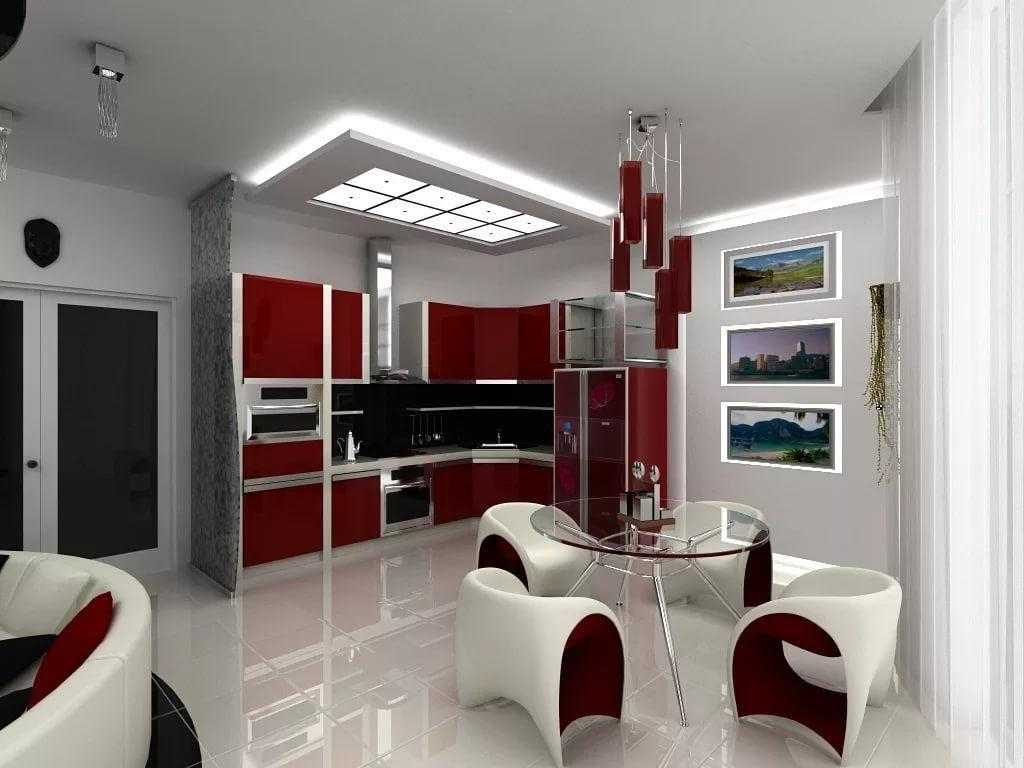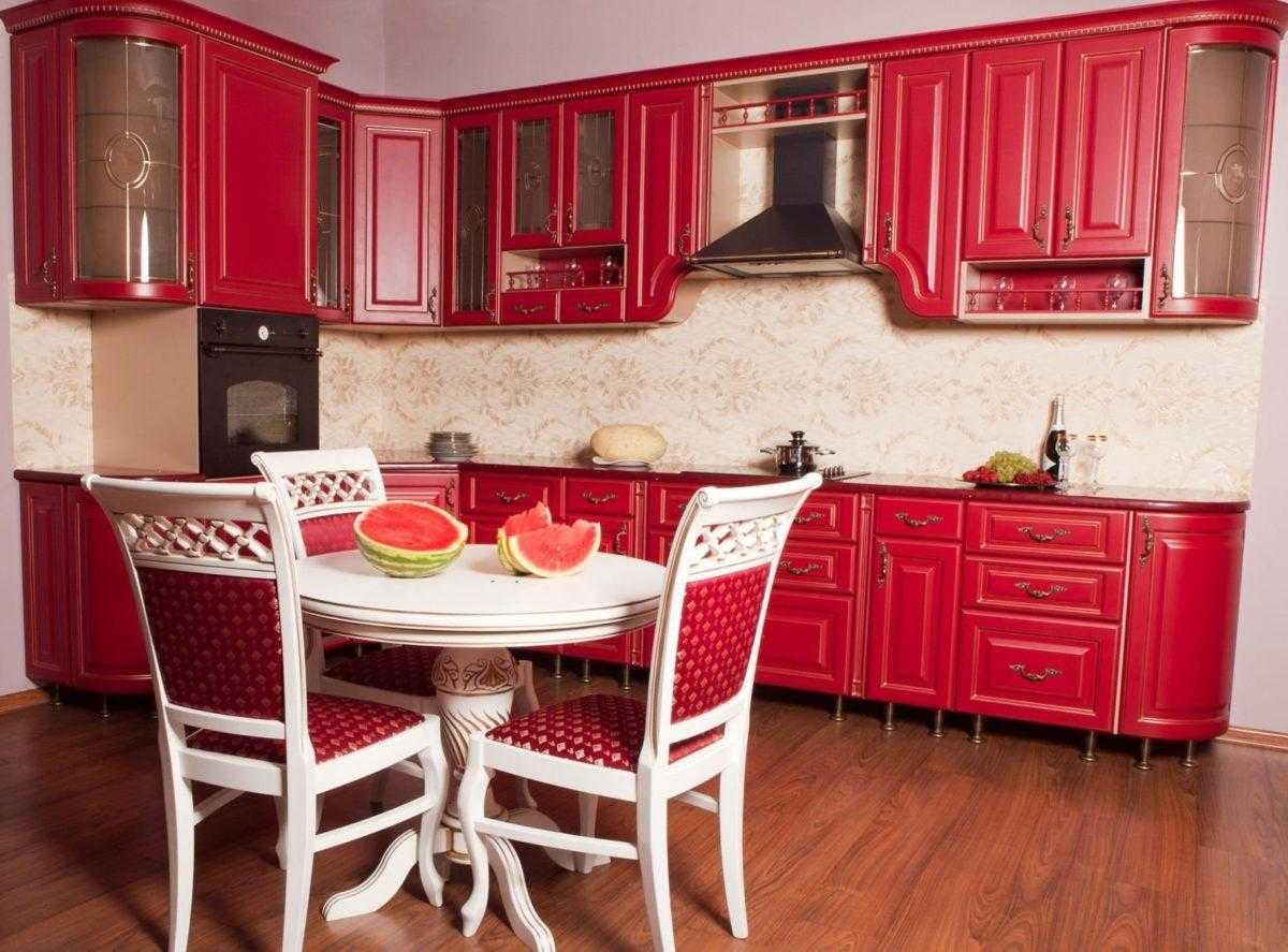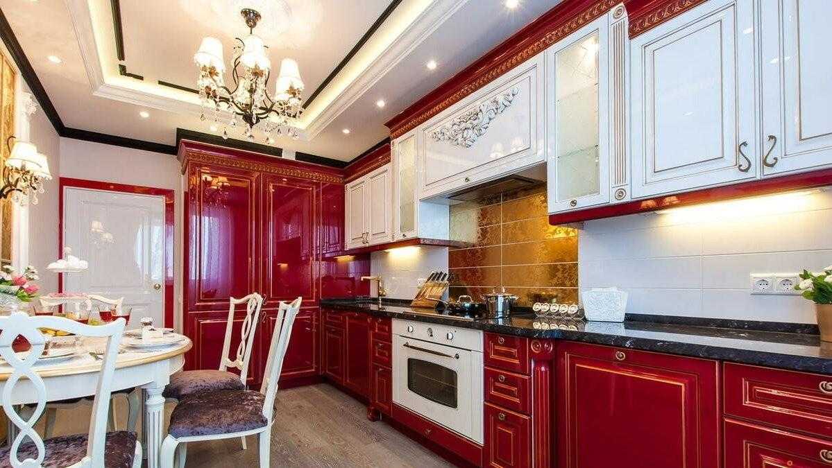 Для стен и потолка обычно используют светлые оттенки (белый, серый, бежевый), а пол выполняют в тёмном цвете. Что касается мебели, то она может быть, как красной, так и чёрной. Для фартука, столешницы, обеденной группы подбирают контрастный колер.
