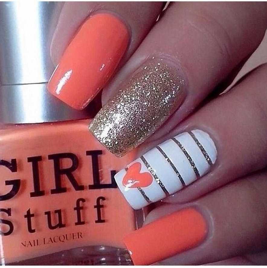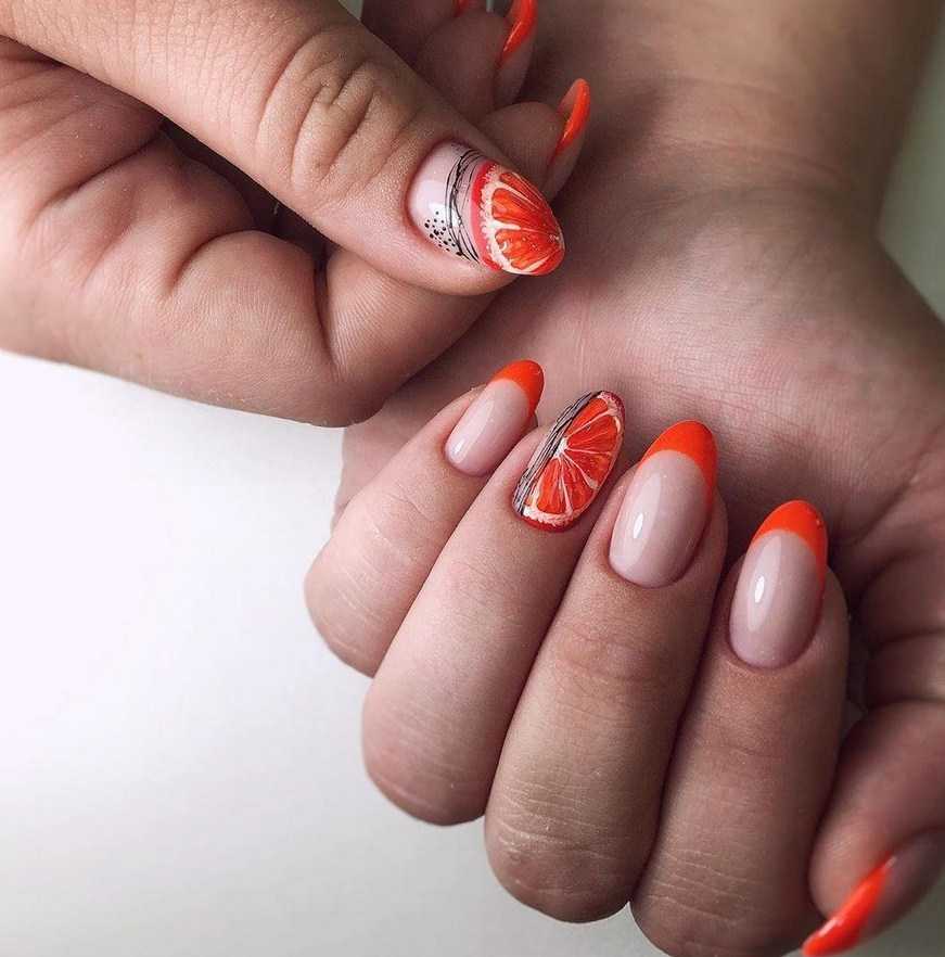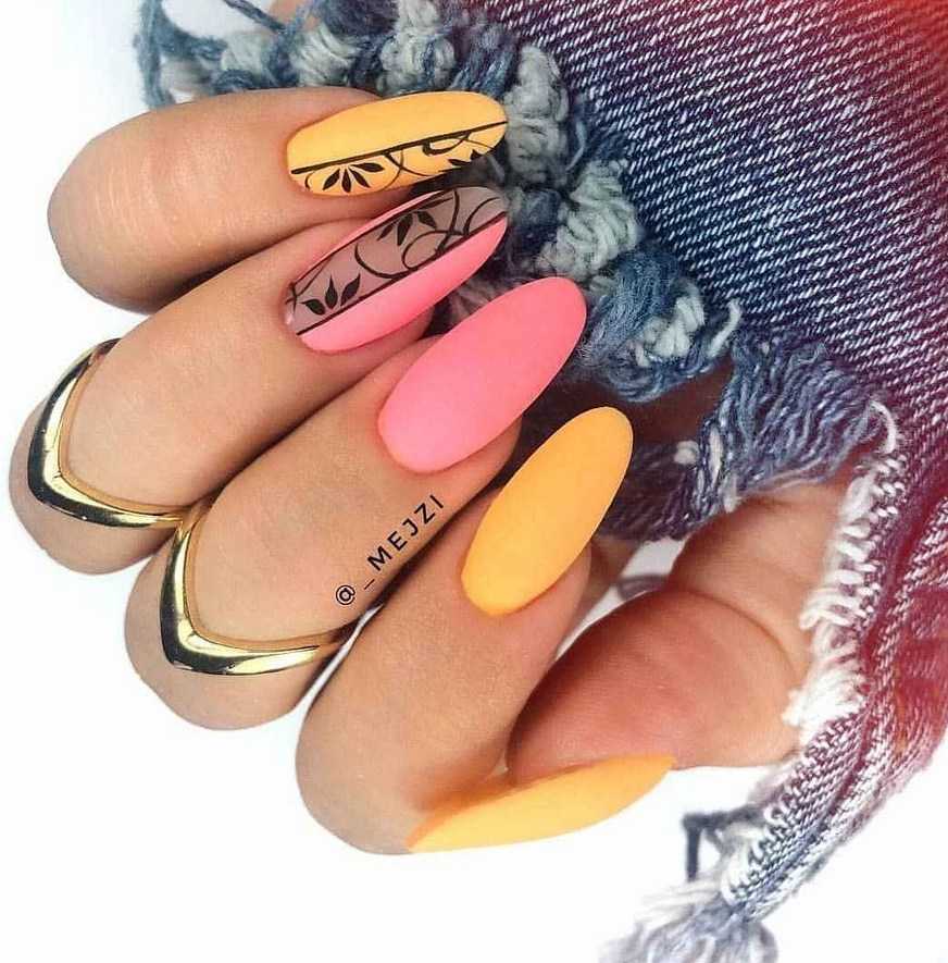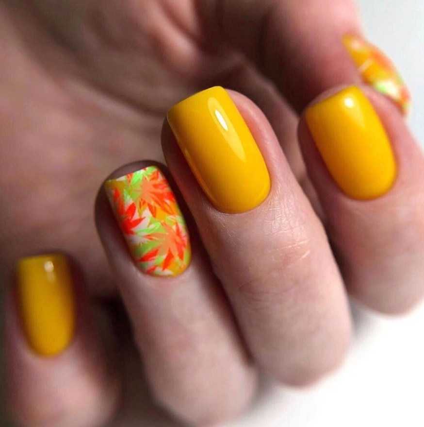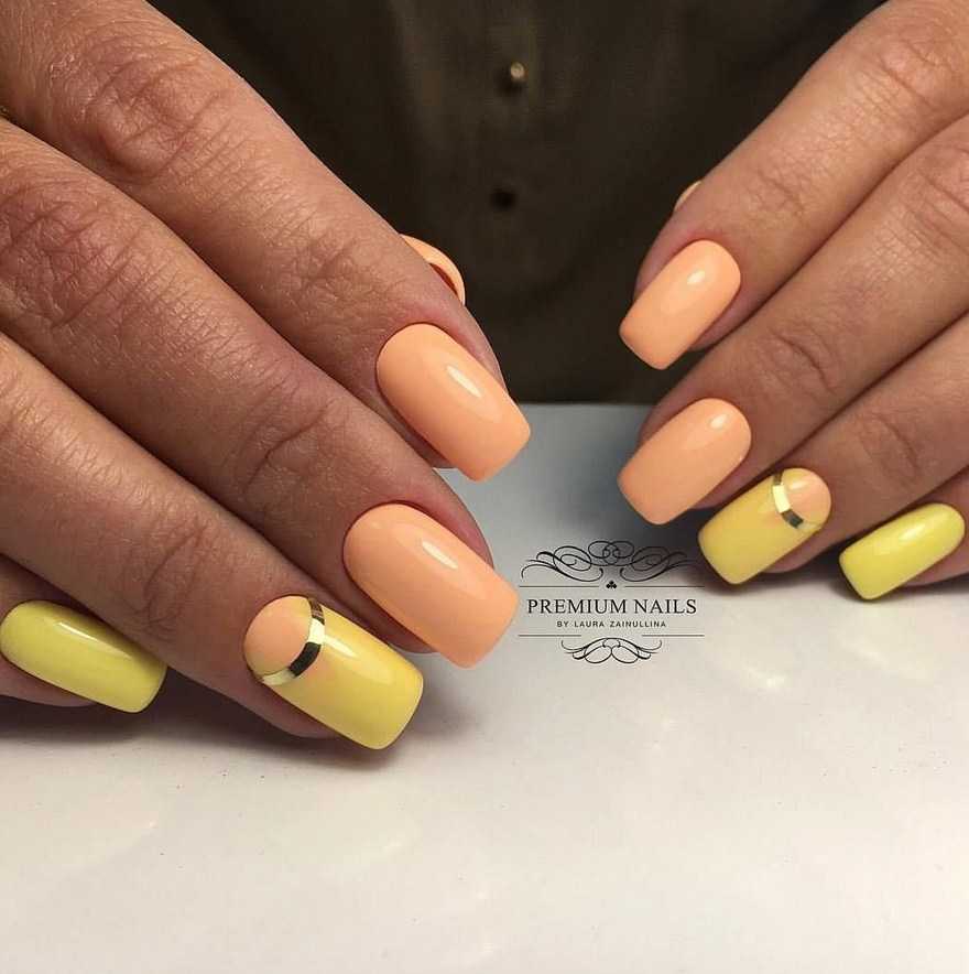 Подобная комбинация прекрасно выглядит летом, ведь она очень жизнерадостная и нестандартная. Лучше брать пастельные оттенки коралла и горчицы, дополняя нейл-артом лёгкий образ.