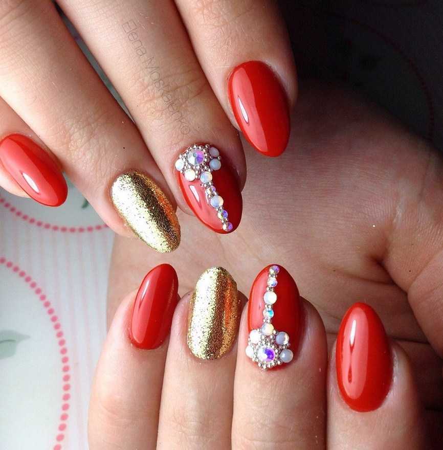 Что касается красного дизайна с втиркой, то в этом году лидирует зеркальная и жемчужная втирка. Они могут быть нанесены как на все, так и только на пару ноготков. Плюс, можно дополнить такой дизайн стразами, градиентом или красивым рисунком.