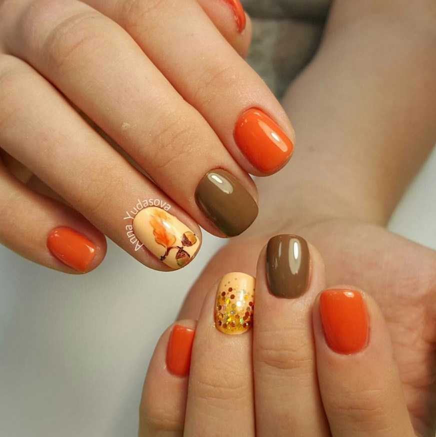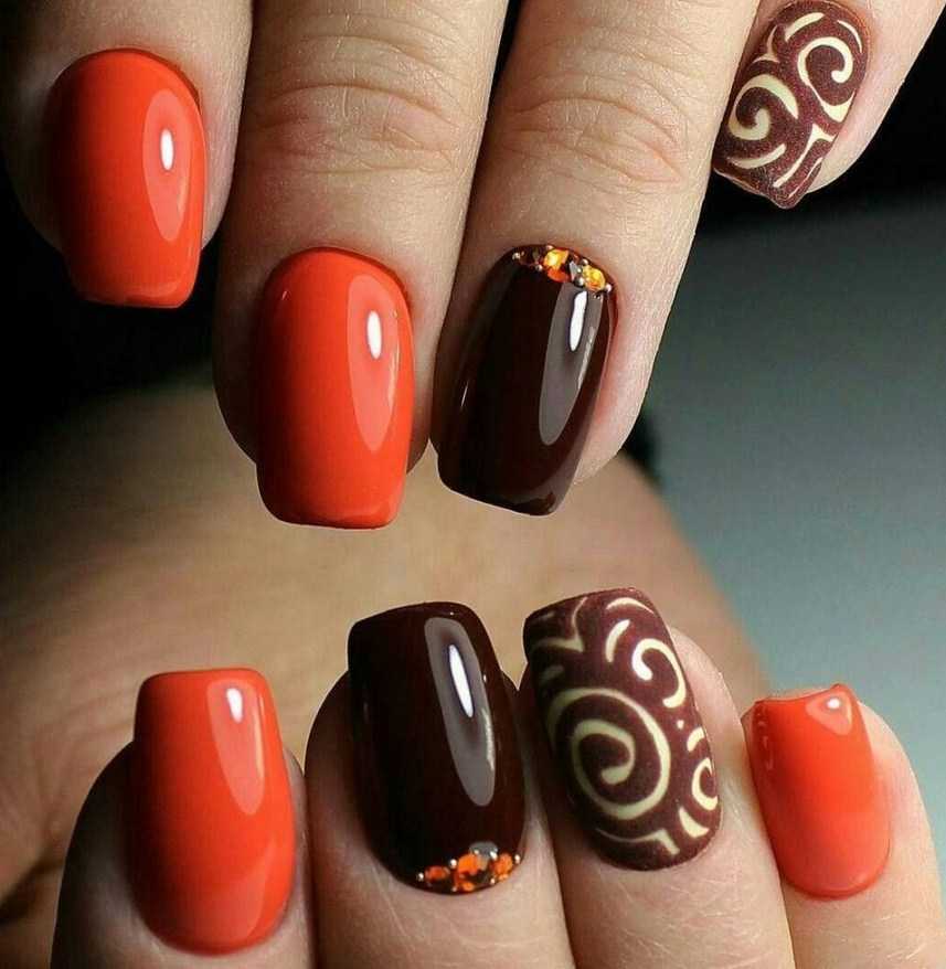 Для элегантного образа или под наряд в тёмных тонах рекомендуется сочетать коралловый лак с коричневыми и шоколадными оттенками. Нейл-арт точно не будет перегруженным или мрачным.