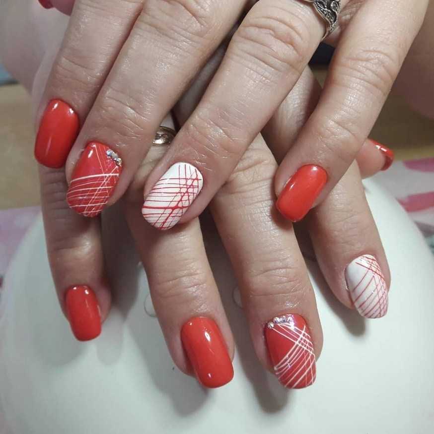 С красными ноготками очень красиво сочетается белая, черная, серебряная или золотая паутинка. Паутинка может быть нанесена как на прозрачный ноготок, так и на ноготок красного цвета. Также, на ноготок, где расположена паутинка, можно добавить несколько отпечатков фольги, или пару наклеек с веточками и цветочками.