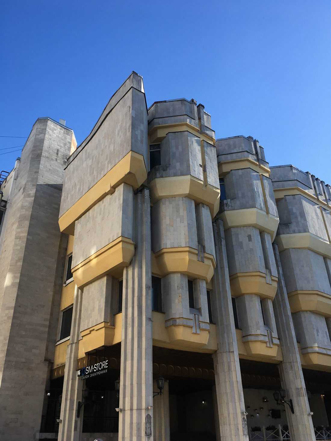 В фасаде здания значительно выделяется крупный прямоугольник без окон, сплошь облицованный доломитом. Поддерживают его «ножки» — как и у домов на Новосмоленской набережной.