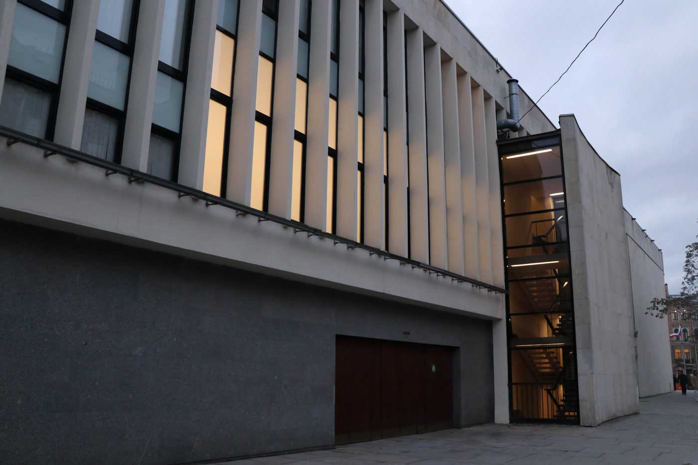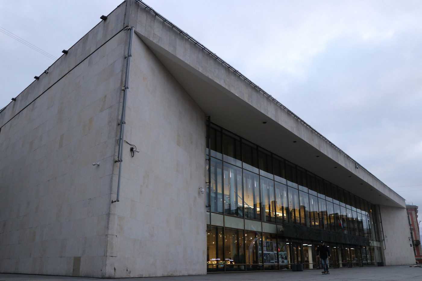 Между тем архитектура концертного зала довольно примечательна и даже была удостоена Государственной премии. Здание состоит из двух симметрично расположенных прямоугольников: фойе и возвышающийся над ним зрительный зал. Фасад фойе полностью остеклён и прозрачен, остальная часть облицована доломитом. Над входом расположен бронзовый барельеф, сделанный скульптором М. Аникушиным. В композицию входили и кассы, которые теперь снесены.