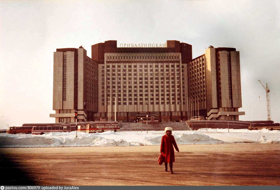 «Прибалтийская» проектировалась таким образом, чтобы фасад здания и веранда ресторана были обращены к морю. Другая часть Н-образной формы отеля выходила на проспект Нахимова. Сейчас сложно представить, что во время строительства гостиницы вокруг неё больше ничего не было. Сначала по правую и левую сторону были построены типовые жилые дома, а несколько лет назад на месте моря появилась насыпная территория с многоэтажным жилым кварталом. Теперь все некогда видовые номера выходят на жилой комплекс.