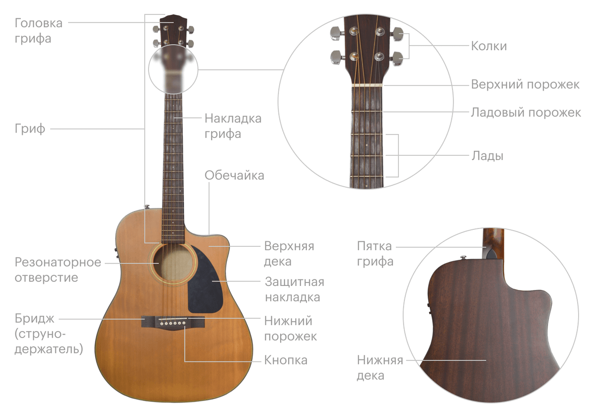 Гриф — длинная часть гитары, вдоль которой натянуты струны. Фронтальная часть грифа — накладка. Гриф поделен металлическими порожками — ладами. Прижимая струну к ладу, мы меняем ее длину, от этого струна звучит выше или ниже. Внутри грифа есть металлический стержень — анкер. Без него гриф от натяжения струн выгибался бы, как плечи лука.