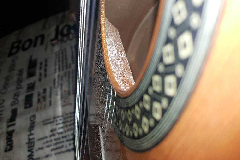 Трещины, сколы лака и выбоины на покрытии. На новой гитаре такого быть не должно, на б/у — допустимо, если это не огромные сколы и если трещины не в самой древесине, а в лаковом покрытии. Гриф и струнодержатель должны плотно прилегать к корпусу, без зазоров и трещин на лаке. Еще стоит осмотреть место, где гриф крепится к деке: там на лаке часто образуются трещины. Чаще всего трещины возникают от неаккуратного обращения с гитарой, неправильного хранения — рядом с батареей или у балкона — и резких перепадов температур.