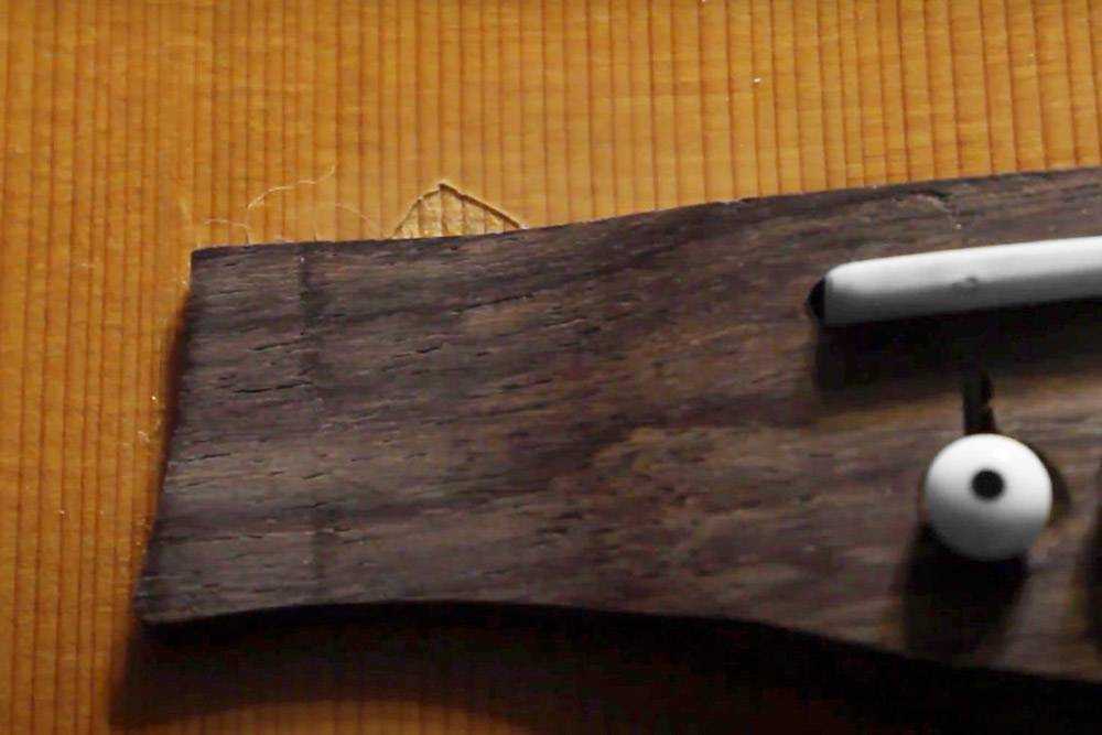 Скол лака в месте приклеивания струнодержателя к корпусу