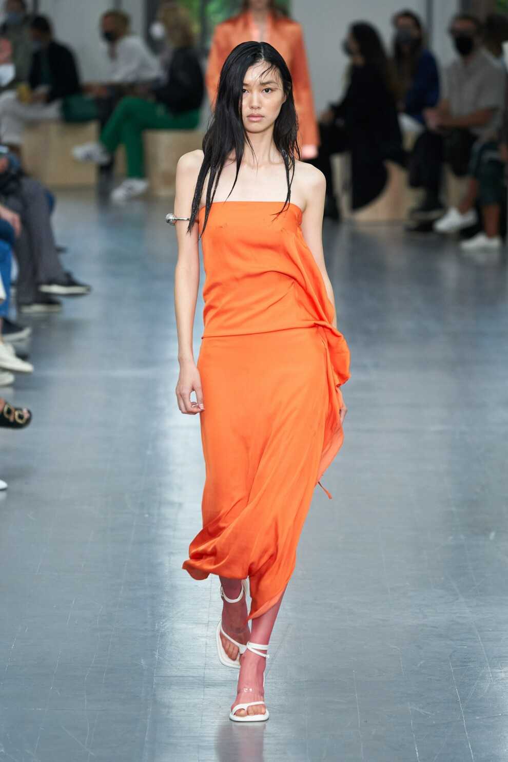 Оранжевый является противоположностью серо-голубого, что подчеркивает контрастность сочетания. Для легкости и свежести образа можно выбрать такие оттенки, как оранжевый, персиковый, темно-оранжевый.