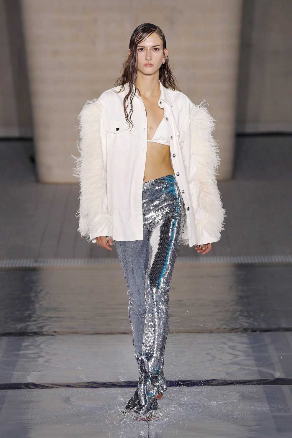 Достаточно сочетать серо-голубой топ с серебристой юбкой и шпильками.