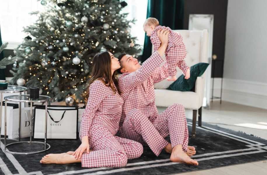Часто главным акцентом сплоченности и счастья в семье выступает гардероб. Популярная одежда для новогодней семейной фотосессии в студии – пижама. Такой простой наряд для сна делает атмосферу еще больше домашней. Лучше если ваш гардероб будет одинаковым – по расцветке, стилю, крою. Оригинальной будет идея с пижамой для мужского пола и ночной сорочкой для женского. Образ для новогодней фотосессии в студии необязательно должен соответствовать празднику. Это компенсирует декоративная зона. Но лучше, если ваш ночной гардероб дополнит новогоднюю картину.