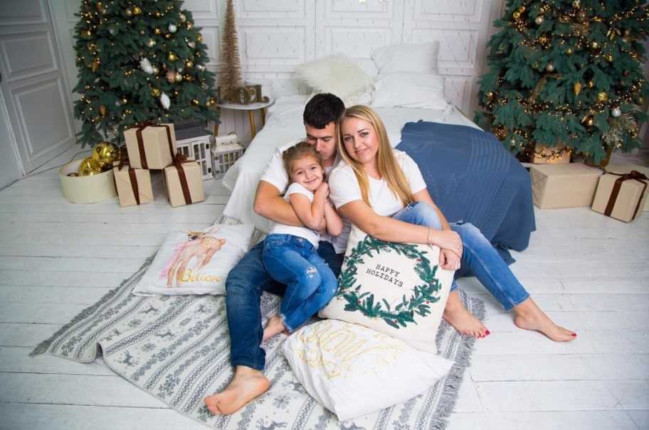 Чтобы съемка была насыщенной и разнообразной, необходимо использовать разные задумки в разных положениях. Позы для семейной новогодней фотосессии в студии должны быть непринужденными, расслабленными, повседневными. Не зацикливайтесь на том, что вас постоянно фотографируют