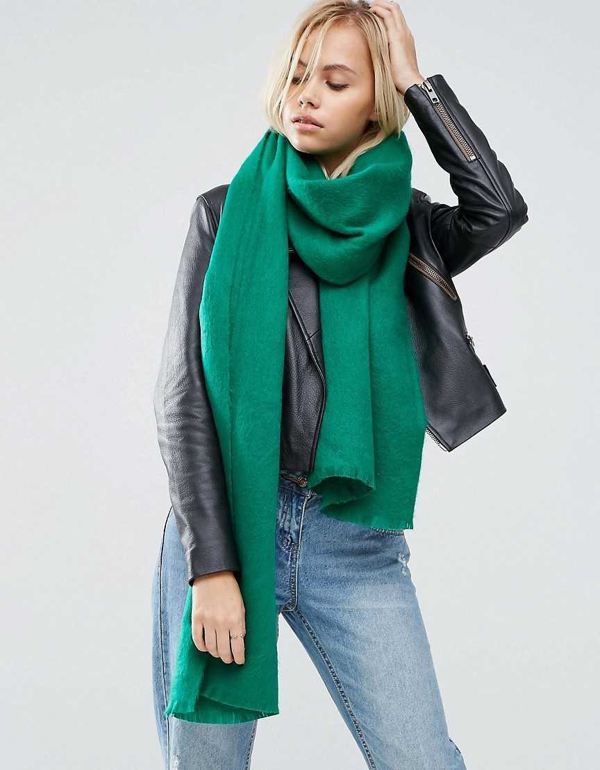 Еще один аксессуар, который будет прекрасным дополнением к образу. Шарф можно использовать в сочетании с черной, бежевой, серой одеждой. В серые будни зеленый придаст краски наряду.