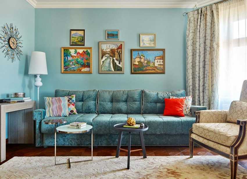 - оттенок небесно-голубого – это достаточно яркие тона, которые могут будоражить кровь, с их помощью акцентируются определенные зоны, так например он используется в картинах, шторах, можно выбрать соответствующего оттенка ковер или пуфик. Популярный цвет в таких помещениях как: ванная комната, гостиная и кухня;