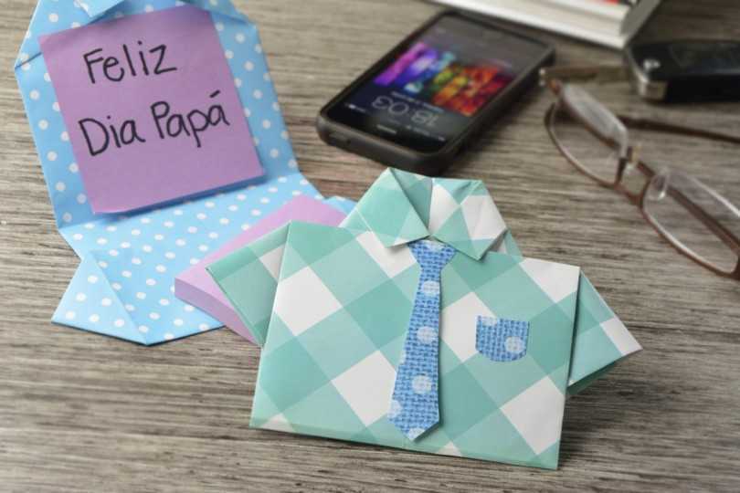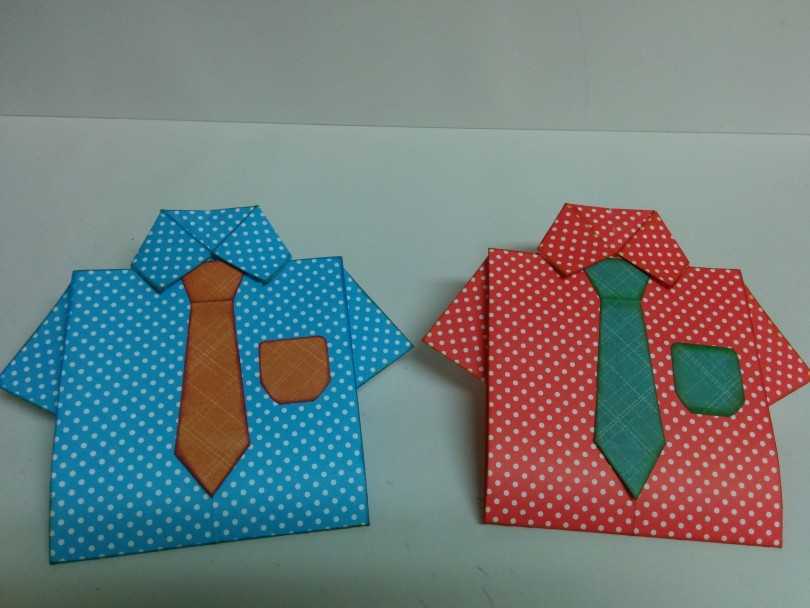 Итак, папина рубашка готова! Ее можно украсить бабочкой-оригами или галстуком, завязанный на Виндзор. Последний штрих –упаковка. Перевяжите поделку на день рождения папе атласным бантом и не забудьте про лейбл.
