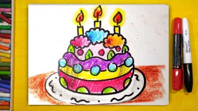 Если ребенок думает, что нарисовать на день рождения бабушке, то вы можете ему подать идею. Например, нарисовать тортик, декорированный свечами. Сверху листа пишем разноцветными карандашами поздравительные слова. Это может быть фраза «С днем рождения» или ее английская вариация Happy birthday. Приступаем к изображению тортика.
