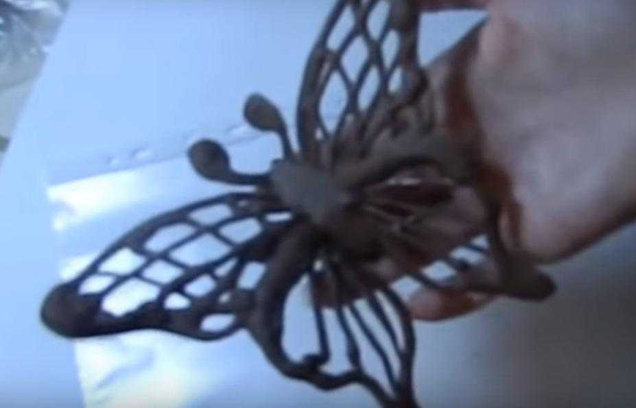 7. Затем растопите оставшийся шоколад, на пергаментную бумагу выдавите туловище бабочки, ведь до этого были сделаны только крылышки. Пока туловище полностью не застыло, вставьте в него ажурные крылья, некоторое время придерживайте их рукой. Когда туловище окончательно застынет, украшения можно использовать для декоративного оформления тортика.
