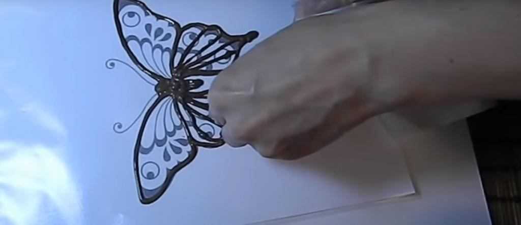 5. Возьмите пакетик в руки и начинайте выдавливать шоколад, обводя бабочек по контуру, создавая красивые узоры на полиэтиленовой пленке.