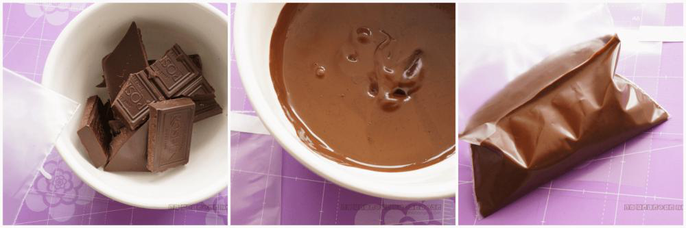 3. Затем шоколадную массу поместите в небольшой пакетик из полиэтилена, чтобы она находилась в одном из углов, где предварительно уже сделано небольшое отверстие.