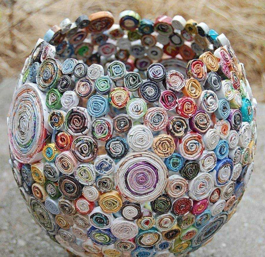 Можно найти другое применение газетным трубочкам. Наклеить картон на дно, а затем жгутами обвивать основу, формируя тело вазы. От наклона трубочек зависит форма изделия. Готовое изделие следует покрыть лаком или разведенным ПВА, чтобы закрепить жгуты, а затем покрасить вазу в любой цвет.