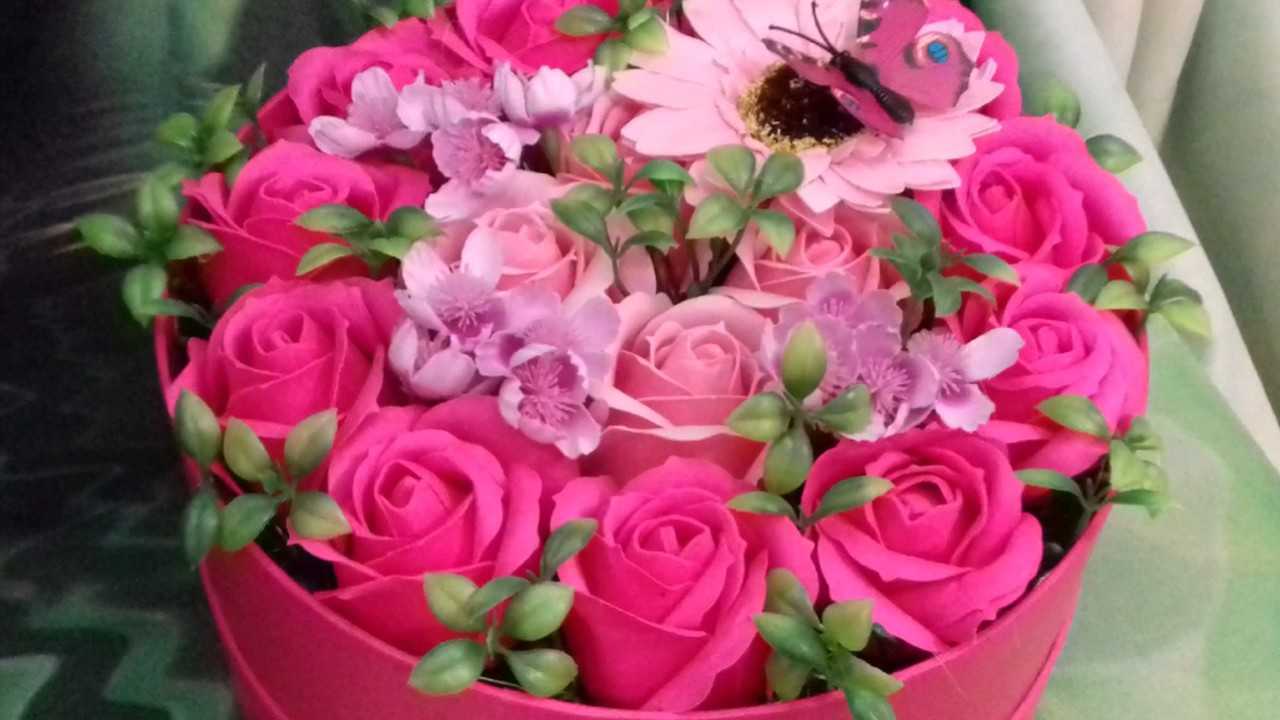 Если решите дарить такую красивую коробку с мыльными цветами, то учтите, вместе с мылом на дно коробки можно поместить еще какой-то подарок сюрприз. Можно также подумать хорошо над композицией, чтобы между мыльными цветами были еще и живые цветы, а также разные сладости и конфеты.