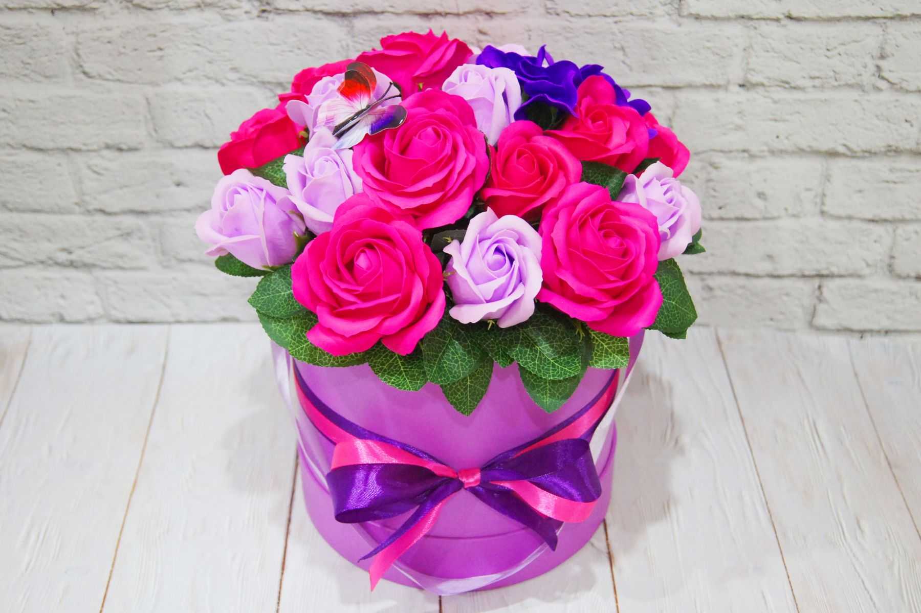 Очень популярно сегодня все упаковывать в подарочные коробки. Мыльные цветы не исключение. Вот такой милый букет, как представлен на фото ниже, может ошеломить вашу избранницу или любимую маму.