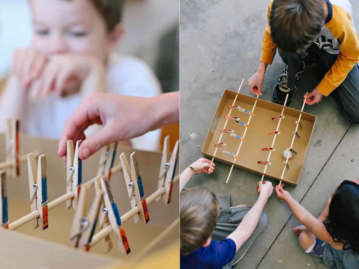 На картоне делаем разметку футбольного поля, устанавливаем ворота при помощи клея. Можно купить игрушечные вороты из пластмассы или же сделать их из проволоки и сетки, получатся они ничуть не хуже заводских игрушечных.