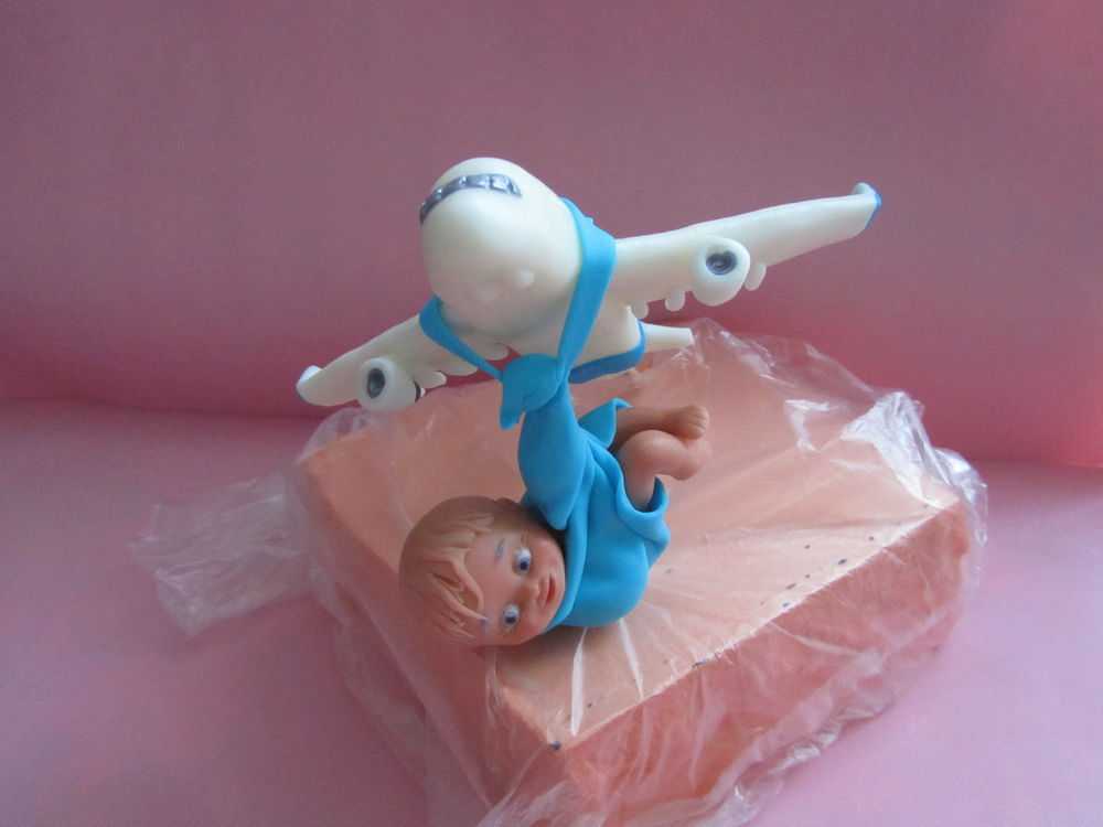 Можете смастерить для карапуза игрушку, с которой он будет играть на вашем пирожном или торте. Если ребенок захочет сделать девочку – это легко. Сплетите из мастики три тоненьких колбаски, заплетите в косички и украсьте мастиковым бантиком. Прикрепите косички к голове малыша.