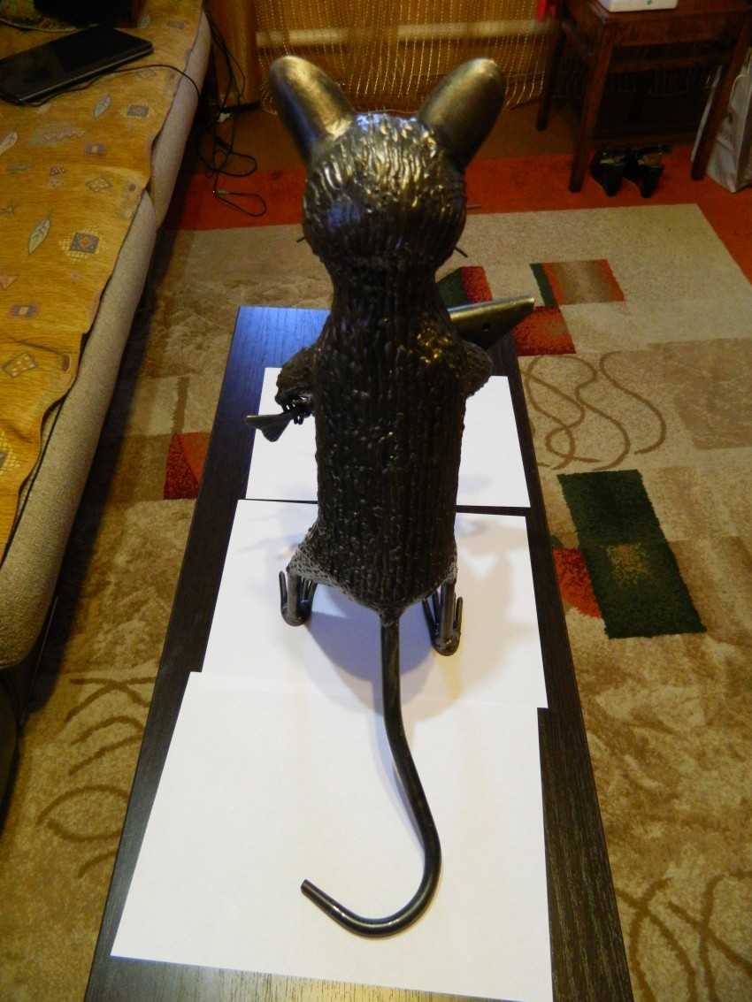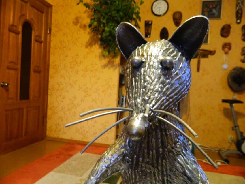 В завершение всего на крысу наносится лак без цвета для получения наилучшего эффекта. На фото поделки из металла зверек покрыт бесцветным лаком, имеющим блестящий эффект. Теперь поделка готова, ее можно подарить своим близким, либо разместить на собственной даче.