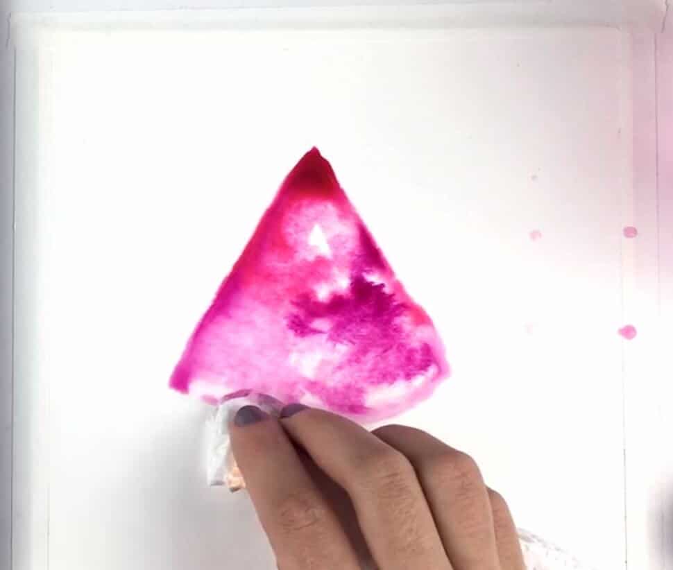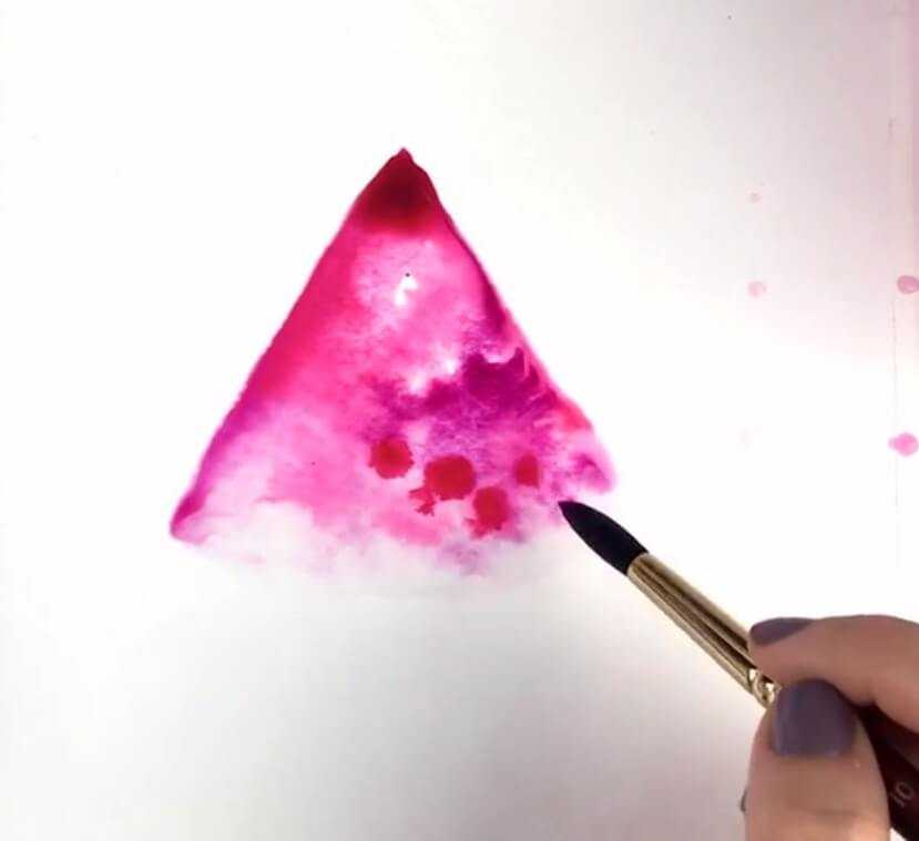 Первое что нужно сделать — смочить кисть большим количеством воды и нарисовать форму внутренней части арбуза. Это простая треугольная форма со скругленным основанием.