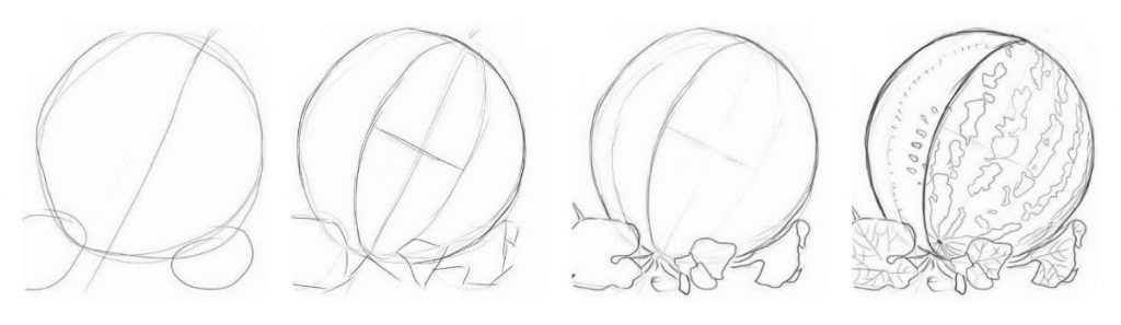 Сначала намечаются контуры будущего арбуза. Форма может быть любой: как в примере, значит, более привычной, круглой.