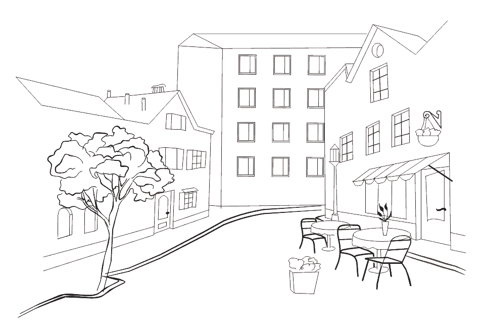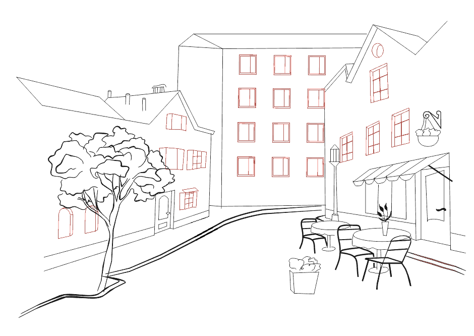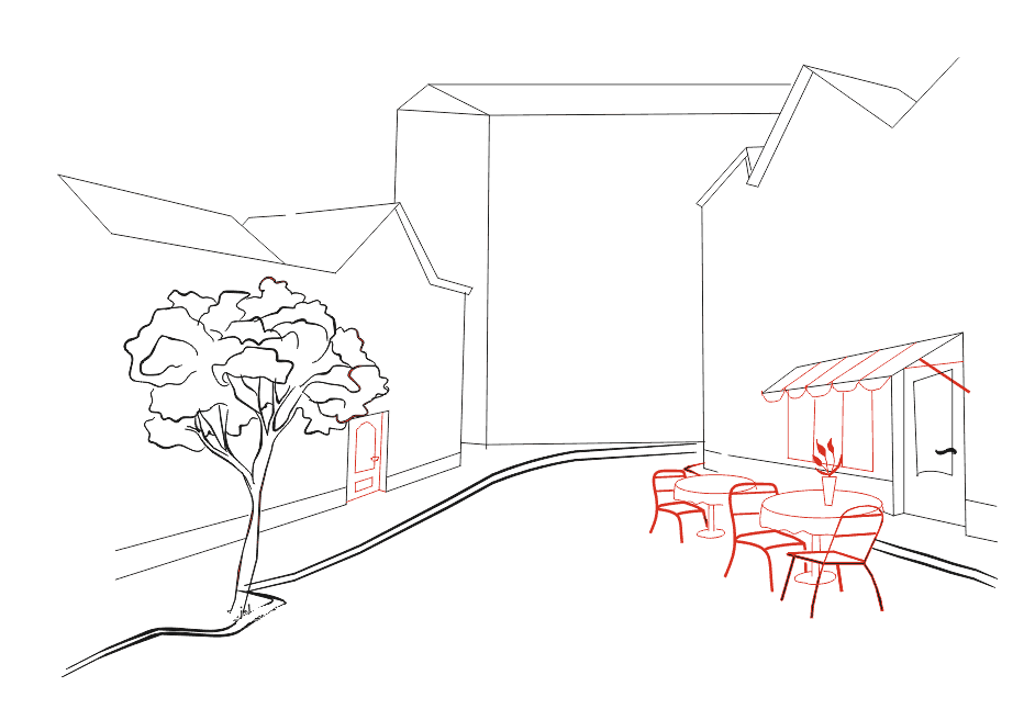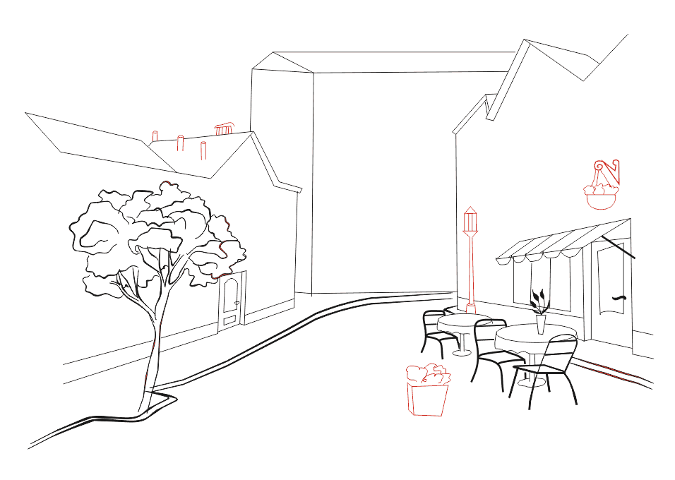 6 этап Продолжаем работать над нашим городским пейзажем. На правой стороне нужно нарисовать столы и стульчики уличного ресторана. Лучше всего рисовать их сначала карандашом, чтобы в случае ошибки её можно было исправить.