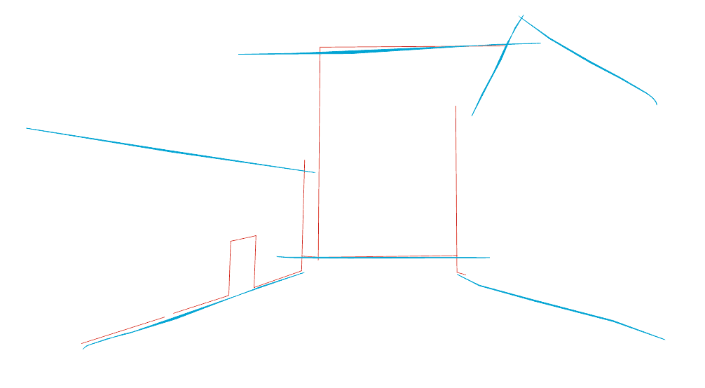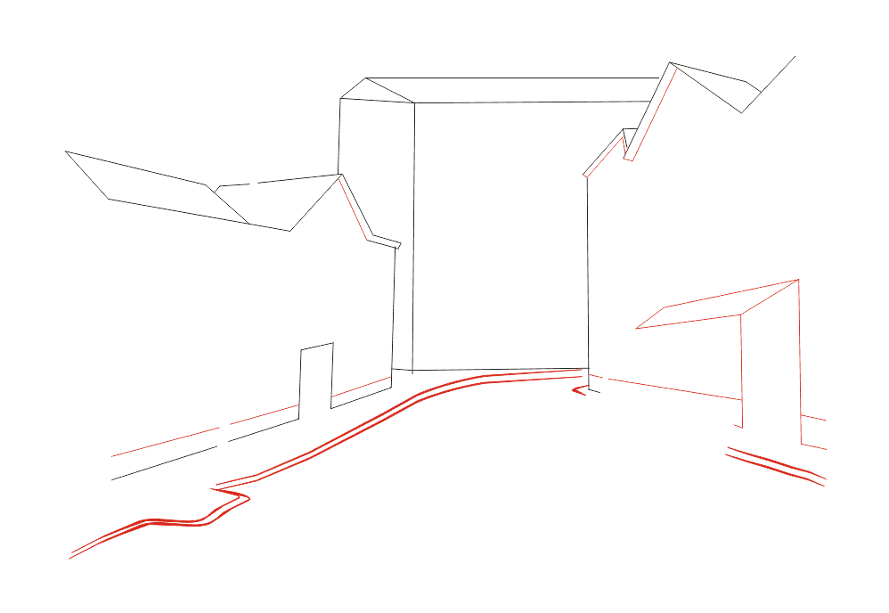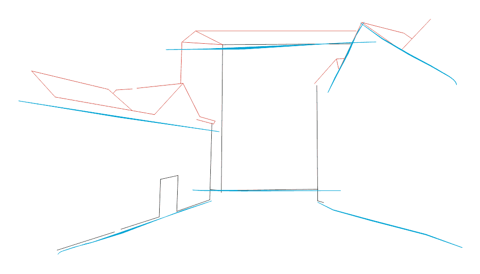 2 этап Продолжаем дорабатывать наши наброски карандашом, сделанные на предыдущем шаге. Рисуем углы зданий и дверной проход у левого дома.