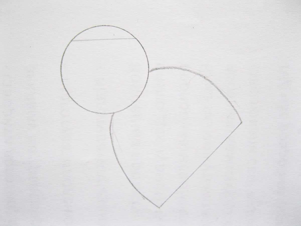Итак, давайте начнем с носика и головы. Сначала рисуем овал и проводим от него длинную полосу сверху и короткую снизу. Затем соединяем концы этих лини еще одной линией в виде полукруга.