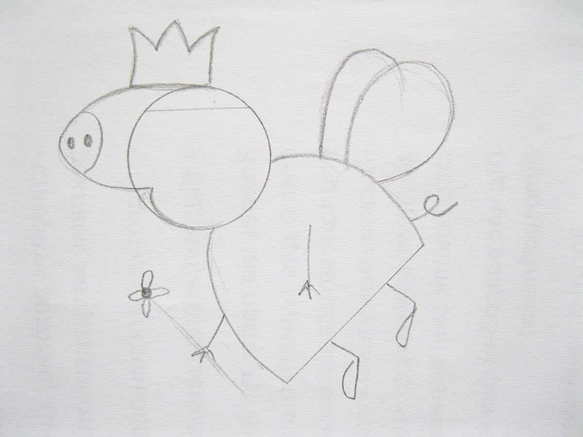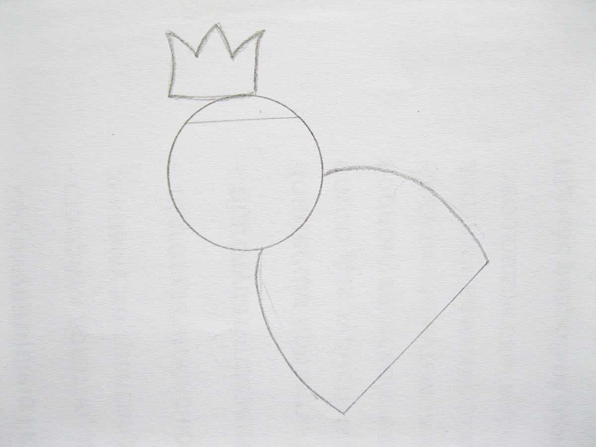 Рисуем свинке платьице и маленькое туловище ее меньшему братику. Платьице изобразите в виде трапеции. Туловище – небольшой круг.