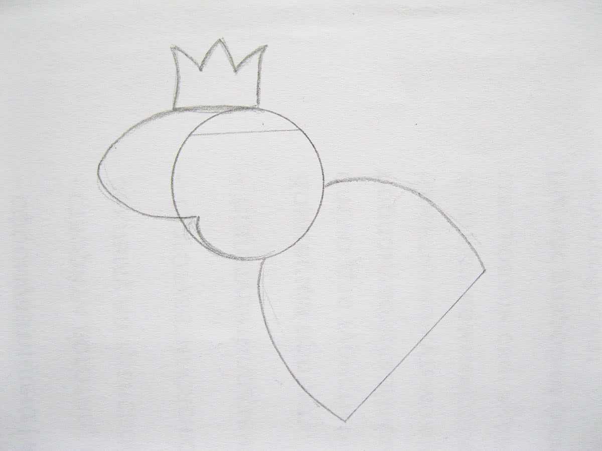 8. Теперь нарисуем на мордочке глаза и рот, а также румянец в виде кружка. Также на короне нарисуем три точки. Это будут драгоценные камни.
