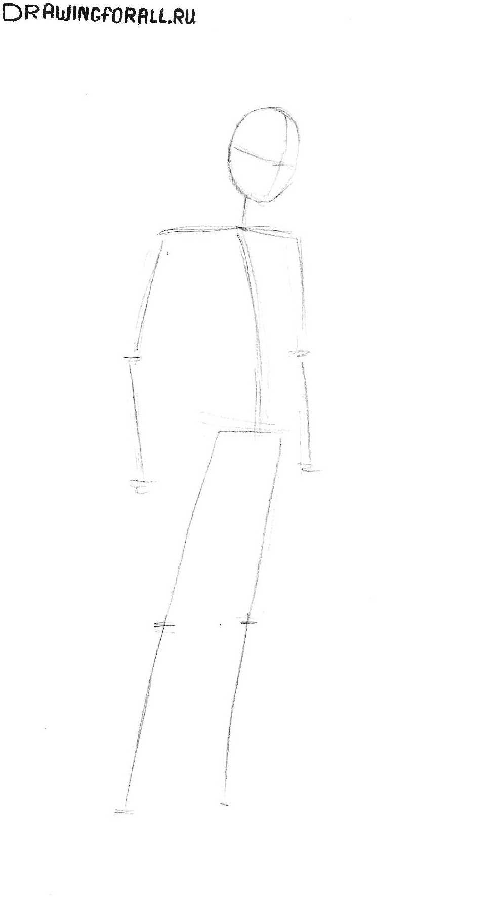 - Руки, вытянутые по швам, доходят примерно до середины отрезка между поясом и коленом (ладони в этом этапе мы не рисуем, так что сейчас руки будут немного короче)