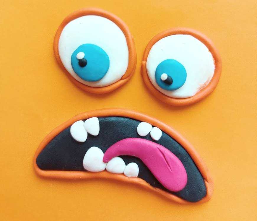 - Для головы дополнительно подготовьте небольшой шарик из того же розового пластилина, но с двух сторон его вытяните так, чтобы получить бугорки. Голова персонажа не круглая, а скорее, напоминает сердечко. Наклейте по центру красную лепешку, заполните ее черным пластилином, но оставьте красную окантовку, и добавьте мелкие зубы. Сверху прикрепите глаза. Голова готова.