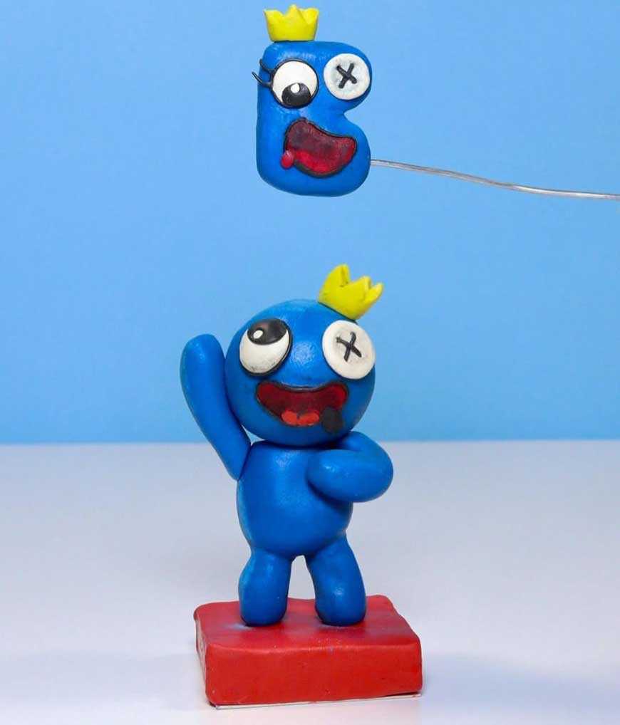 - Из синего пластилина скатайте очень длинную колбаску, обмотайте вокруг шеи и завяжите бантик. Получилась девочка персонаж Киси Миси, знакомая всем игрокам.