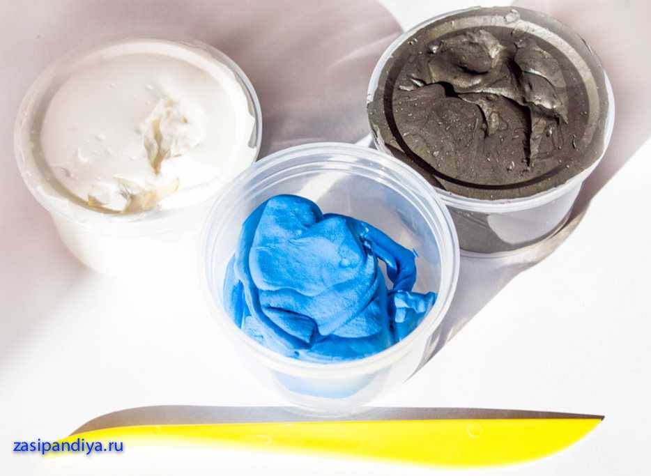 Для начала я взяла массу трех цветов: синий, черный и белый. Синий и белый смешала и получила голубой. Так же для работы мне пригодился стек и карандаш.